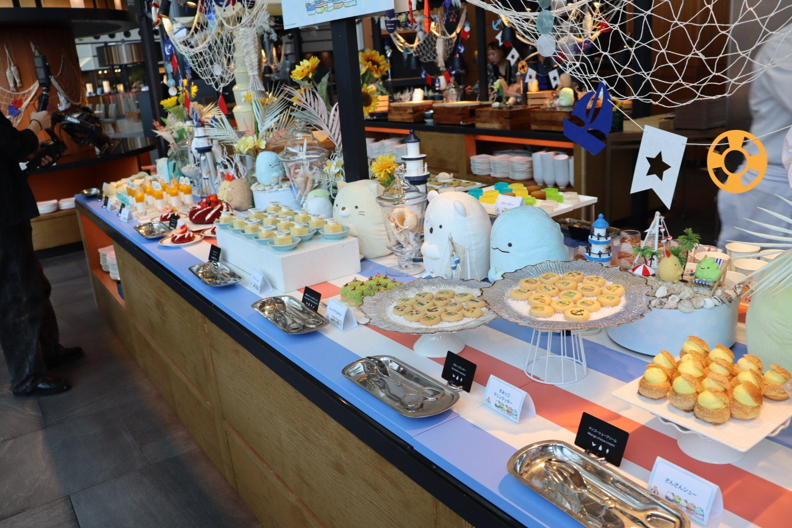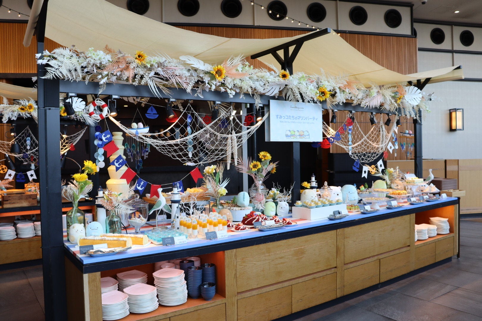 夏らしくブルーを基調としたフレッシュなデコレーションなどマリンパーティの世界観が演出された会場で、かわいらしいすみっコたちとヒルトン福岡シーホークの上品な雰囲気の中で特別なスイーツビュッフェをお楽しみいただけます。