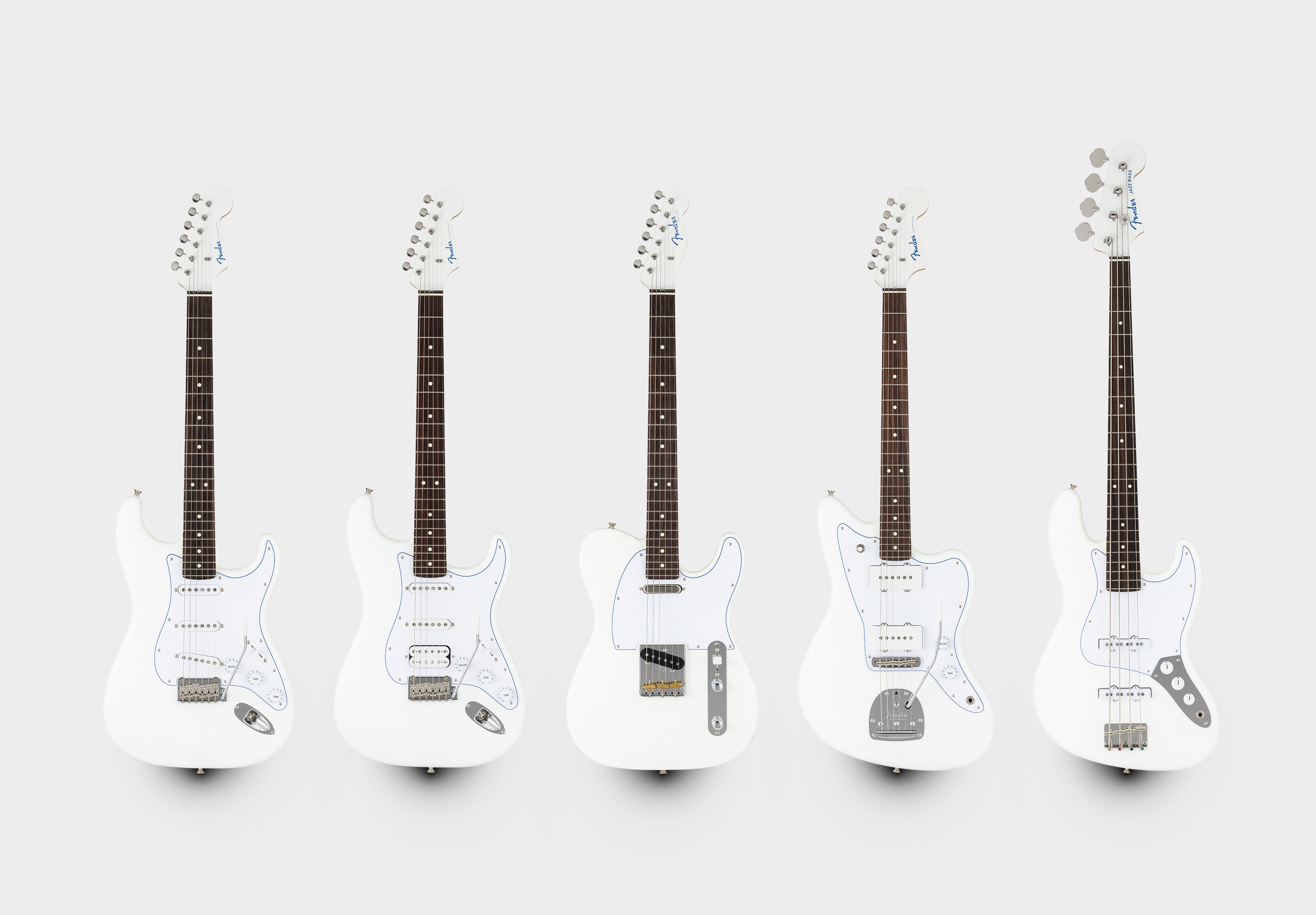 一方、『Made in Japan Limited Hybrid II Blanc』はサテン仕様のホワイトなボディに、目を引くブルーのセンターレイヤーを纏った3-Plyホワイトピックガードを搭載しており、マッチングヘッドに輝くブルーメタルロゴと相まって軽快な雰囲気を醸し出します。プラスチックパーツも全てホワイトで統一することで、より純白さを際立たせます。Noirシリーズと同様に、Telecaster®︎、Stratocaster®︎、Jazzmaster®︎、Jazz Bass®︎、そしてFender Flagship TokyoならびにFender公式オンラインショップ限定モデルとなるStratocaster®︎ HSSをラインナップします。