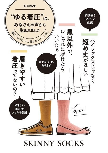 「履きやすい着圧ソックスがほしい」「黒以外で、おしゃれに履きたい」「短め丈がほしい」の声から生まれたラクに履けて普段ばきができるおしゃれな着圧ソックス「SKINNY SOCKS」発売