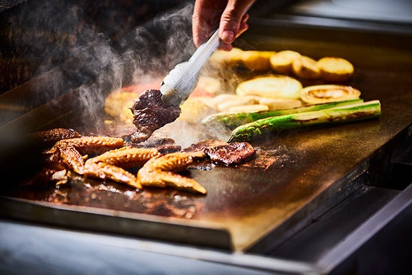 鉄板台で黒毛和種牛や国産の豚肉や鶏肉、夏野菜を