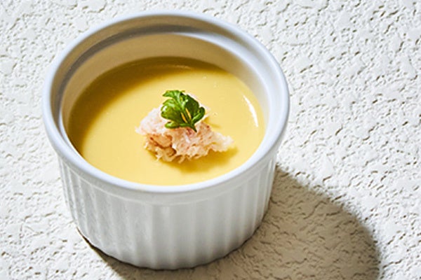 「とうもろこしのババロア仕立て ずわい蟹飾り」