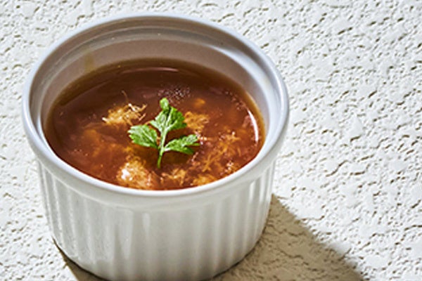 スイカジュースにトマトのピューレを加え、ガスパチョ風に仕上げた“冷製スイカのスープ“は甘みと酸味のバランスを調えた一品です。”冷やしおでん“は夏らしく涼風に薄口仕立てでスッキリと。変わり種のトマトもおすすめです。中国のたまり醤油を使って黒く仕上げた”叉焼入り黒炒飯“は見た目よりもあっさりとお召し上がりいただけます。