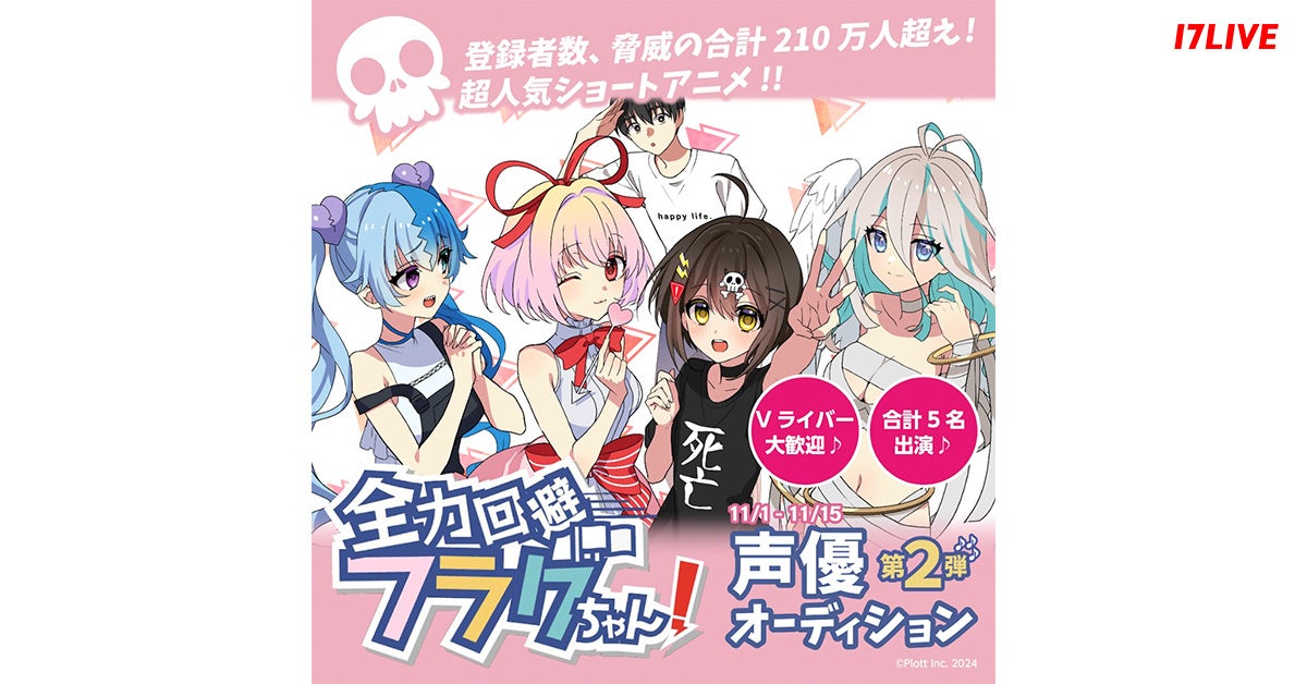 本日より開催する『「全力回避フラグちゃん! 」声優オーディション 第2弾』は、「17LIVE」で活動中のライバー、もしくは活動予定で18歳以上の方であれば、誰でも参加が可能です。上位入賞者のうち、本イベントにて行われるメインゲストキャラクターおよびサブゲストキャラクター声優オーデイションで見事選ばれた合計5名が、「全力回避フラグちゃん!」のYouTubeにて配信を予定している動画内(1話限定)に、入賞者を模したオリジナルキャラクターを制作の上、声優出演することができます。なお、今回はサブゲストキャラクター声優オーディション合格者3名のうち、1名以上はVライバーから選出いたします。