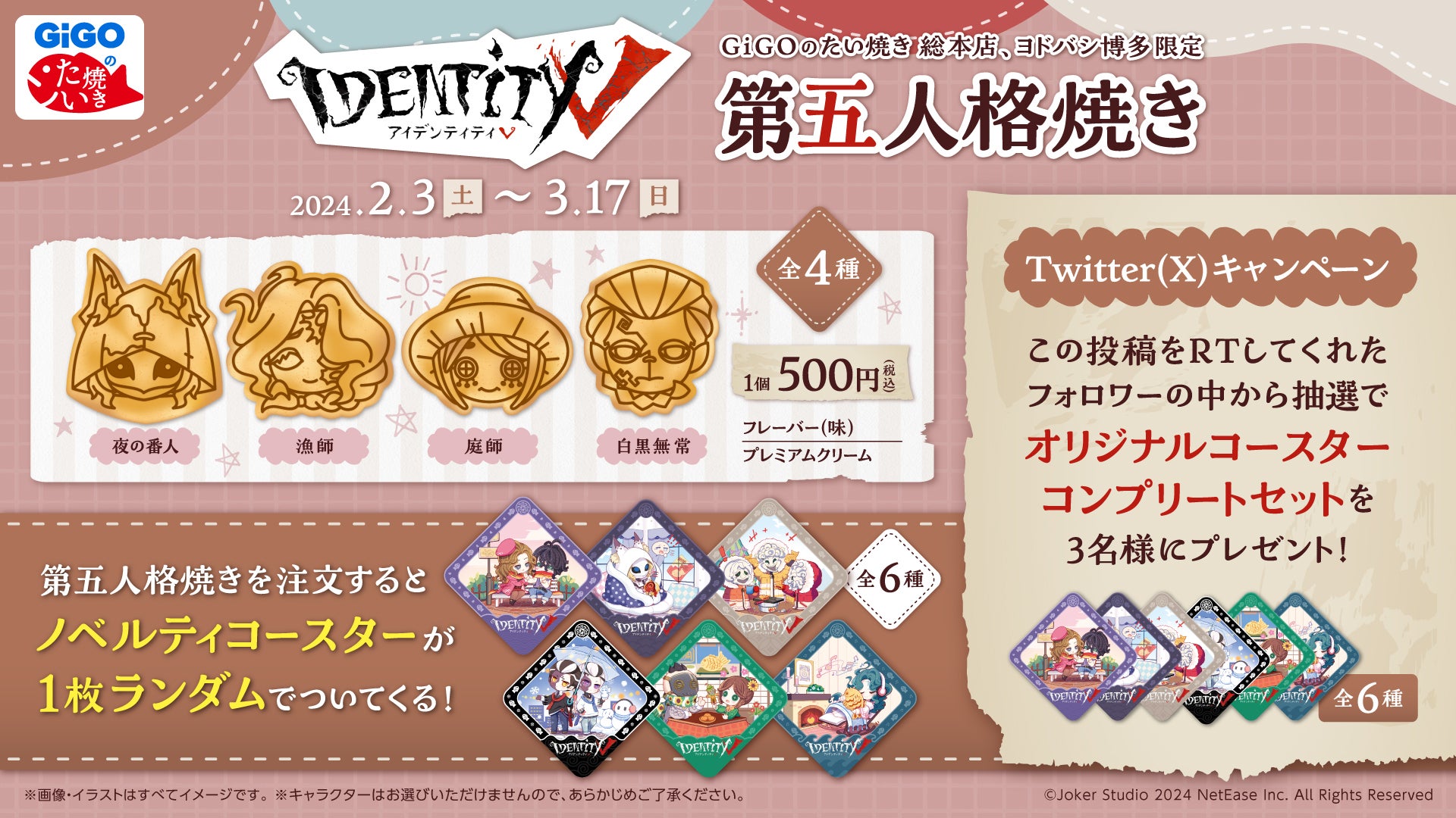 株式会社GENDA GiGO Entertainment(本社:東京都港区 代表取締役社長:二宮 一浩 以下、当社)は、GiGOグループのお店におきまして「IdentityV 第五人格」とタイアップした「第五人格焼き」を2023年2月3日(土)より、販売いたします。また同時展開でノベルティ付きドリンクの販売も致します。