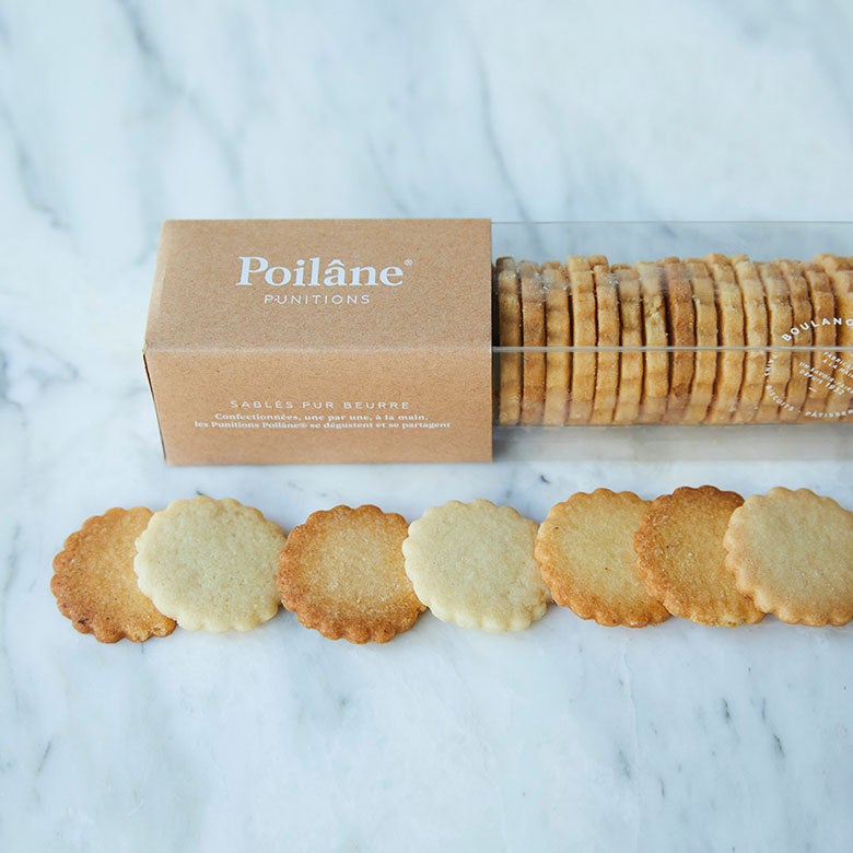 ポワラーヌのお店地下のもみの木の薪をくべた石窯でじっくりと焼き上げる、小麦粉、バター、砂糖、卵とシンプルな素材で作った伝統的なクッキー。原料の小麦粉には、フランスの小麦産地として有名なボース地方やブリ地方の最高級のものをブレンド。ゲランド産の天然海塩を加えています。「ピュニション」とは、フランス語でおしおきという意味。ポワラーヌ氏は子供のころ祖母が「おしおきだよー!」と呼んでは、手のひらいっぱいのサブレをくれたとのこと。そんな幼少の思い出が名前の由来に。