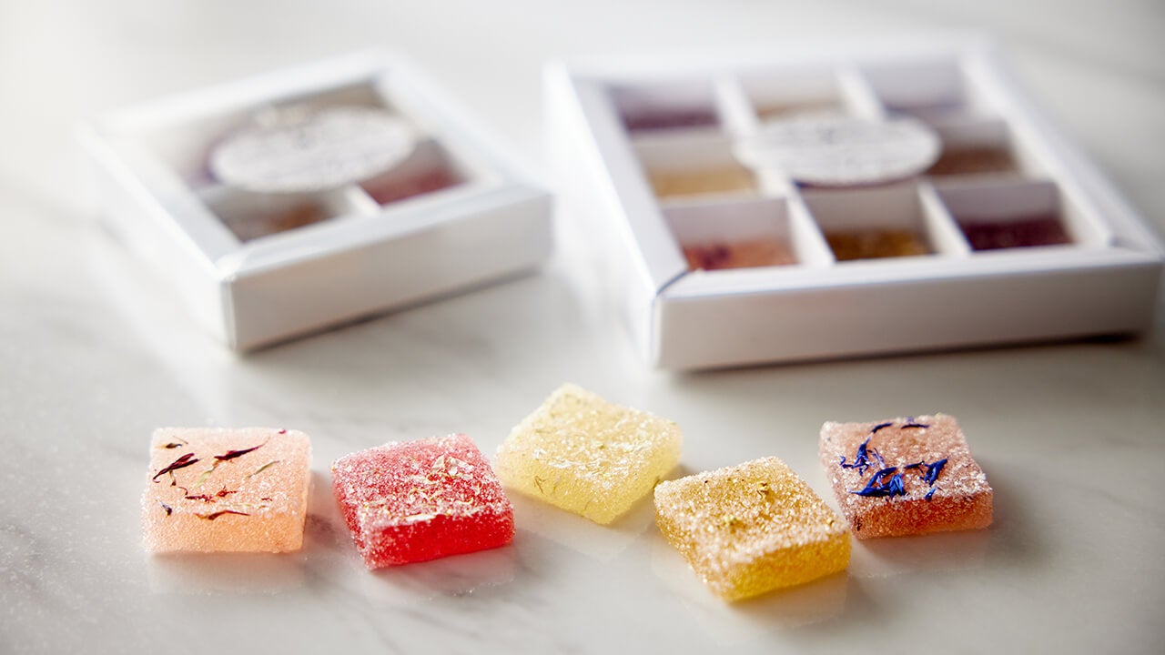 フランスより直輸入で届く、有機栽培の花を使用したパートドフルール(フランス伝統の砂糖菓子)や、コルシカ島のクレメンタインでつくるフルーツコンフィ、製造期間が3ヶ月のみの幻のヌガーなど、目にも美しいコンフィズリーが揃います。