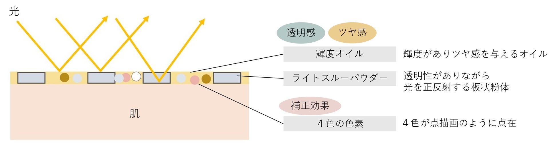 メーク膜には、輝度オイルと、透明性がありながら光を正反射する性質を持つライトスルーパウダーを配合。メーク膜表面で光を反射するとともに、光がメーク膜を透過し肌表面で反射するため、発光したような透明感とツヤ感を演出。さらに色素と板状のライトスルーパウダーが整列するため、薄膜でありながら、色ムラを自然にカバー。