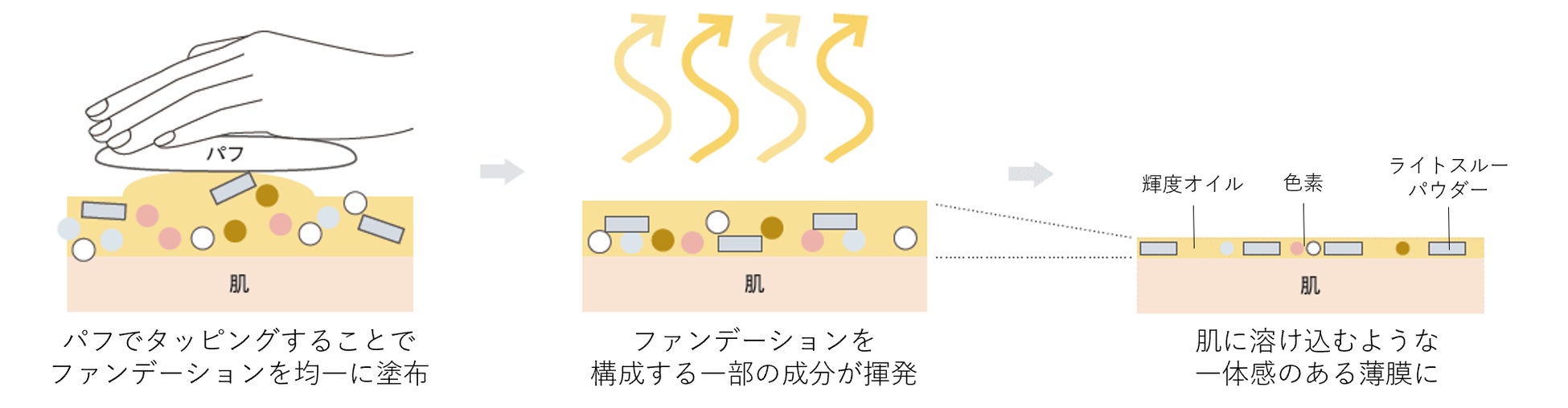 パフでタッピングしてなじませることで厚みが均一になり、さらにファンデーションを構成する一部の成分が揮発する処方により、肌に溶け込むような薄膜に仕上げる設計。