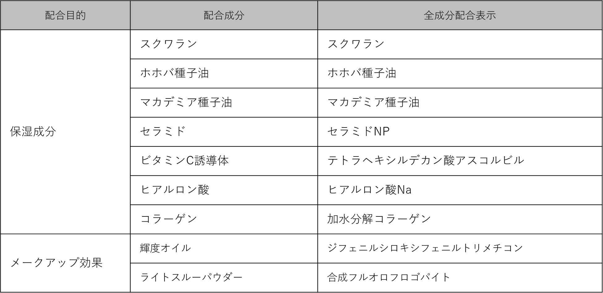 スクワラン、ホホバ種子油、マカデミア種子油、セラミド※3、ビタミンC誘導体※4、ヒアルロン酸※5、コラーゲン配合※6。