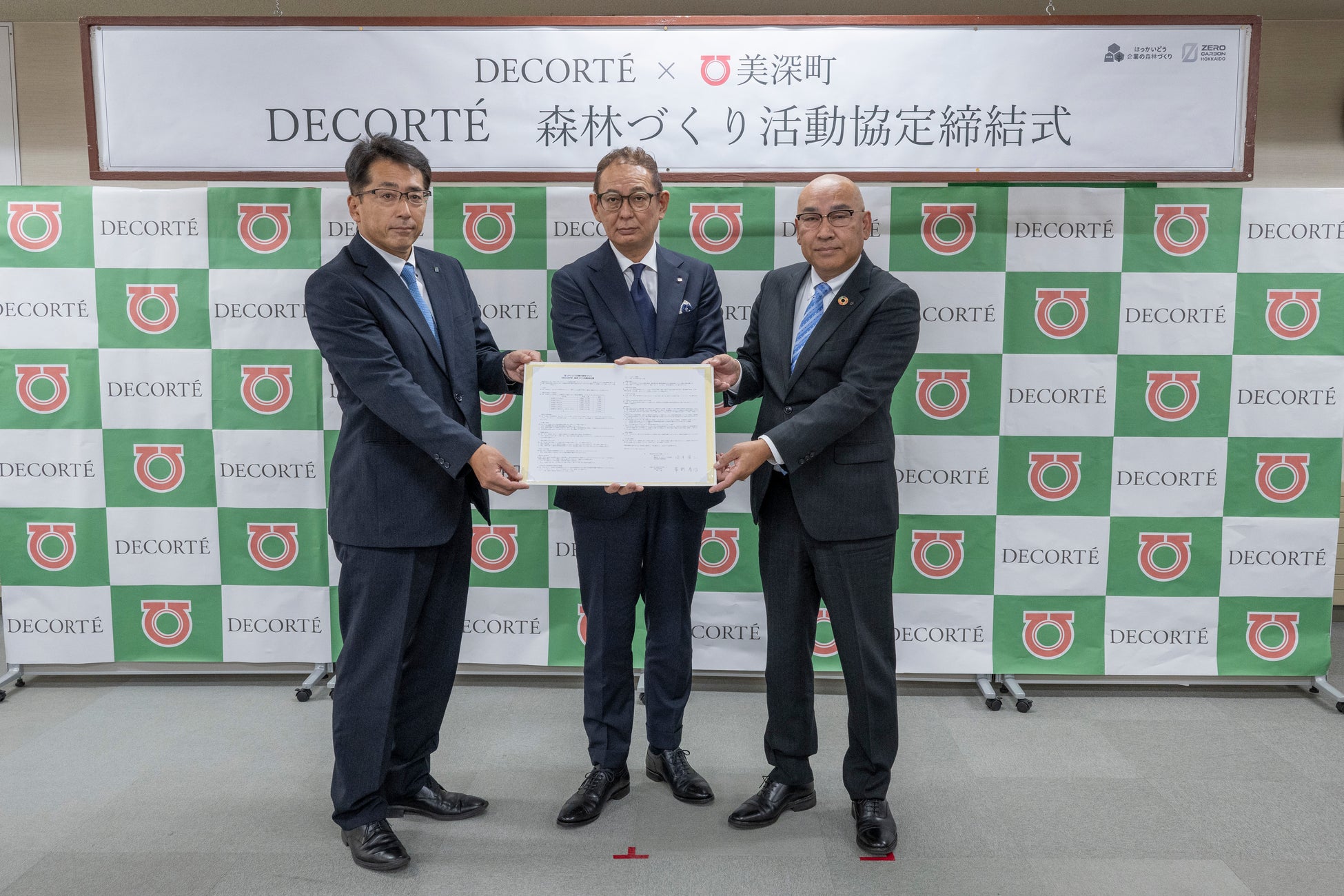 2024年9月25日に「DECORTÉ 森林づくり活動協定締結式」を美深町役場(所在地:北海道美深町)にて開催しました。締結式には、株式会社コーセー 取締役 マーケティング本部長 兼 DECORTÉ事業部長 田中慎二、美深町長・草野孝治氏、北海道上川総合振興局長・竹澤孝夫氏が登壇し、美深町と『コスメデコルテ』の2者で署名を行いました。