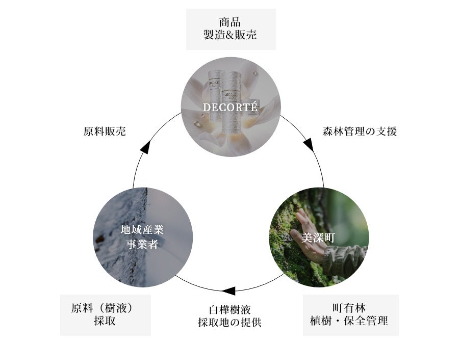 第1弾の取り組みとして、『コスメデコルテ』の象徴ライン「AQ」の原料の一つである「白樺水」の産地、北海道美深町を支援する『DECORTÉの森プロジェクト』を開始します。『DECORTÉの森プロジェクト』では、美深町が保有する町有林において、植樹や間伐などの森林管理の支援を行います。将来的には、この森から採取した白樺樹液で商品を作ることで、原料づくりから生産・販売まで一貫して関わり、持続可能なサイクルを築いていきます。