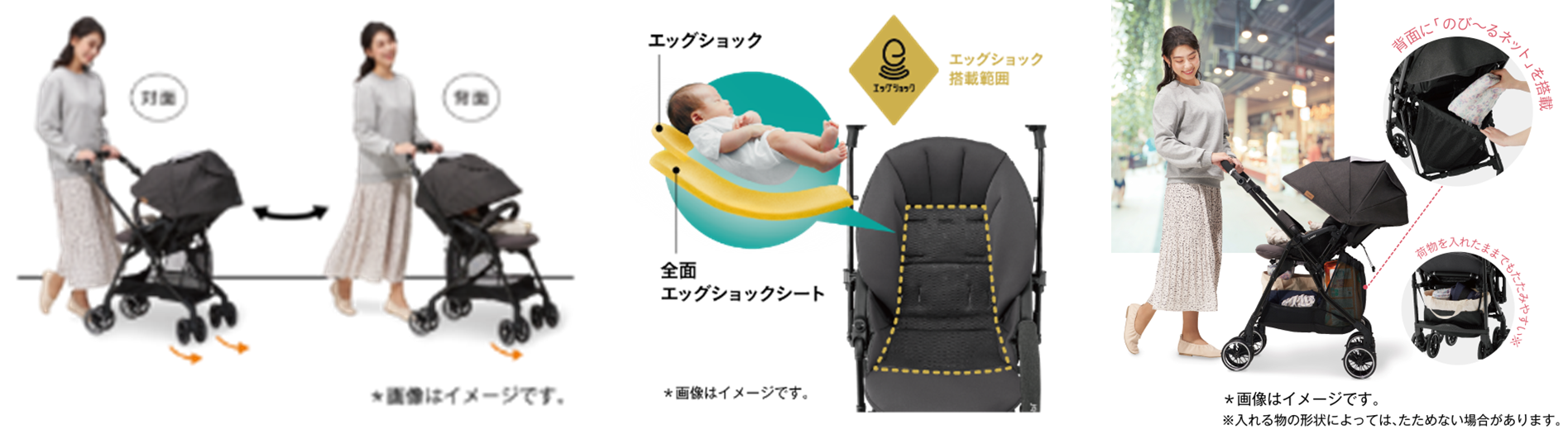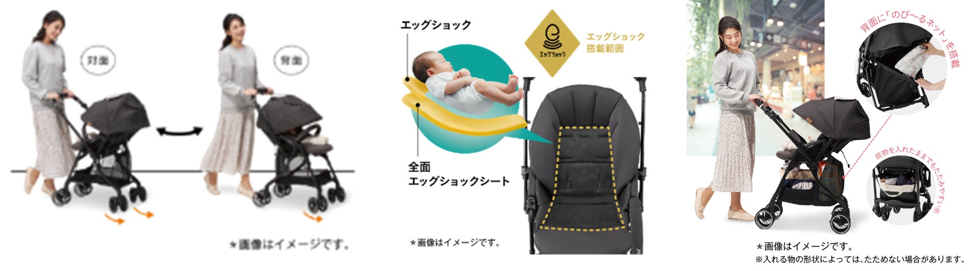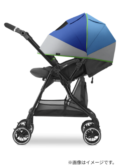 特 徴:軽量車体ながら、赤ちゃんに伝わる路面からの不規則な揺れを軽減するために、卵を落としても割れないほどの超・衝撃吸収素材「エッグショック」をシート全面と、頭部には枕状で搭載し、赤ちゃんの乗り心地にこだわりました。東京パノラマライン沿線の特徴である空と水辺のブルーと豊かな緑を象徴するグラデーションラインを表現した大型幌は、夏の強い日差しから赤ちゃんのデリケートなお肌を守ります。背面間口には、荷物をたっぷりと収納できる伸縮するネットがついたマルチネットバスケットを搭載し、利用者の使い勝手の良さにもこだわりました。
