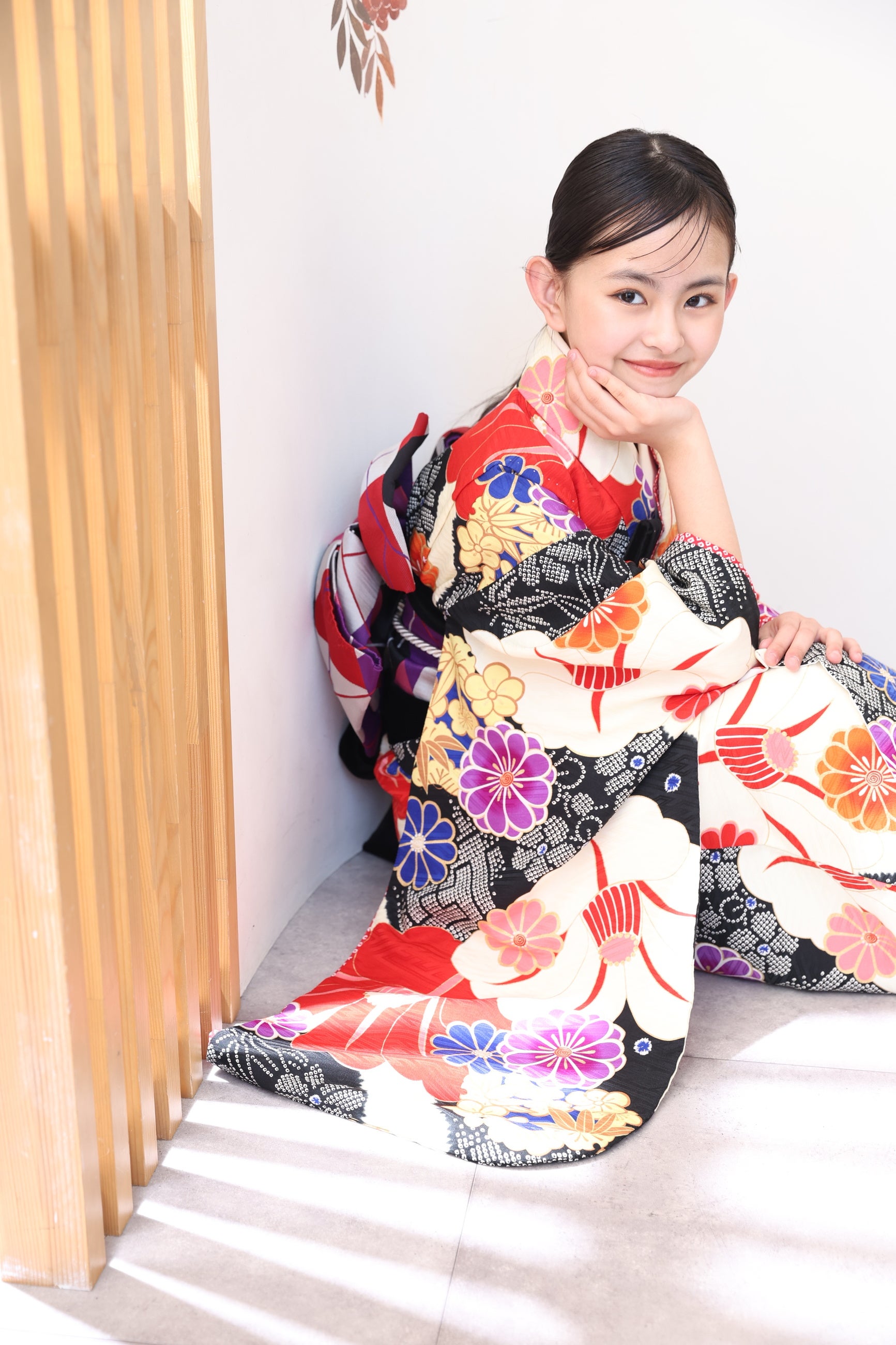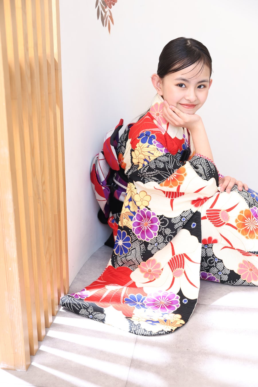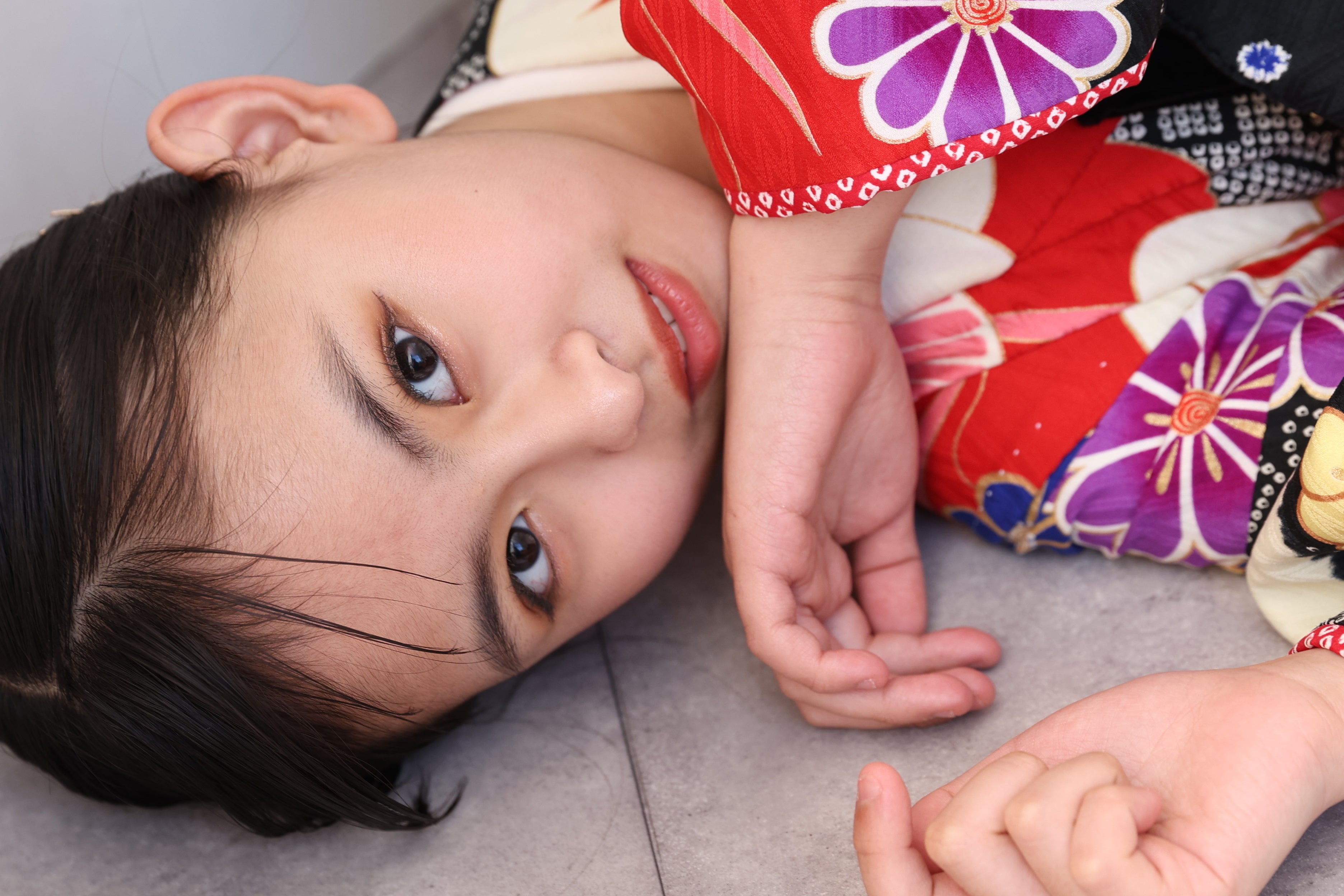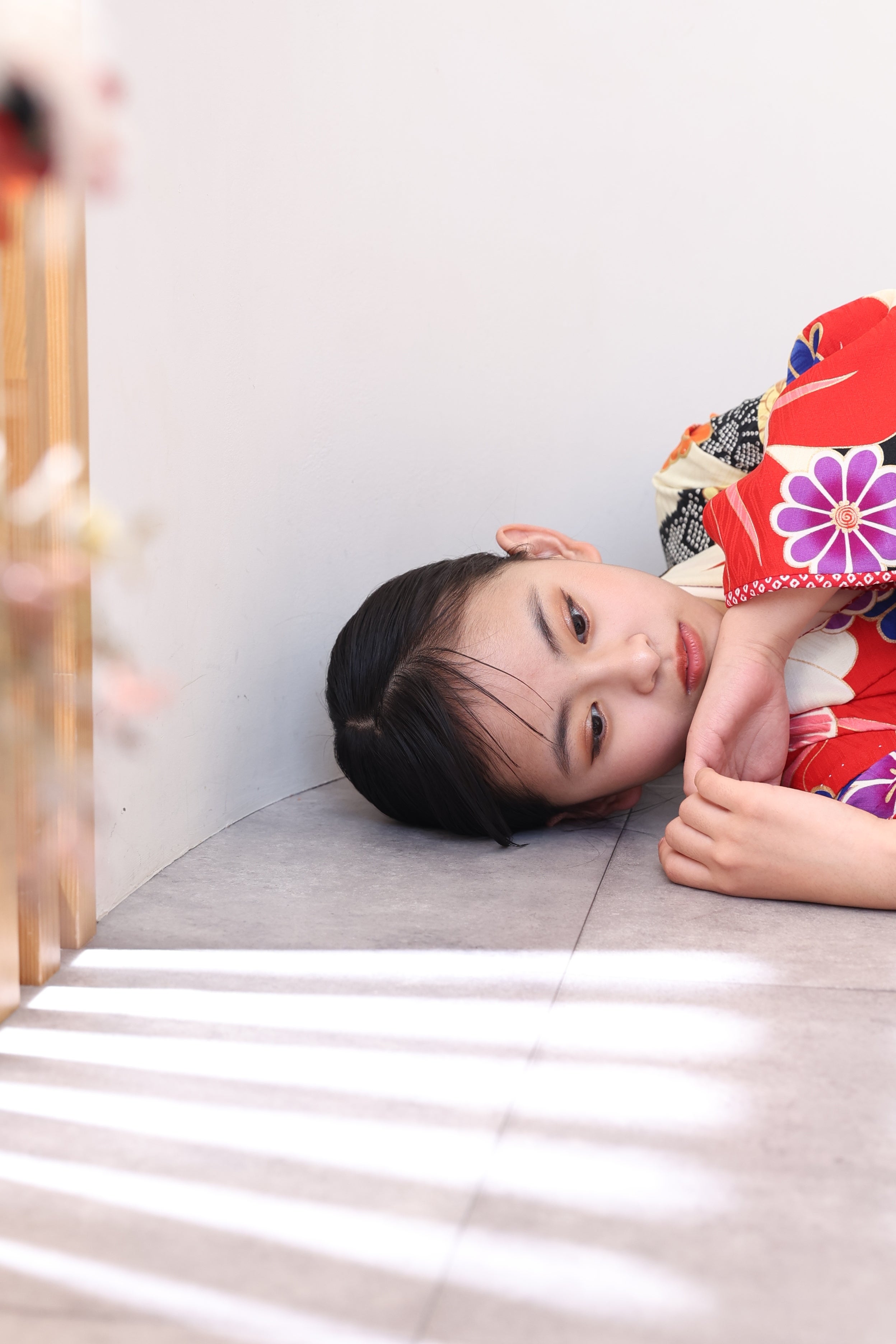 和風モダンなお部屋に古典的な着物を合わせることで風情あふれる雰囲気を演出し、明るく差し込む光と表情、ポーズでフレッシュさも忘れずに。