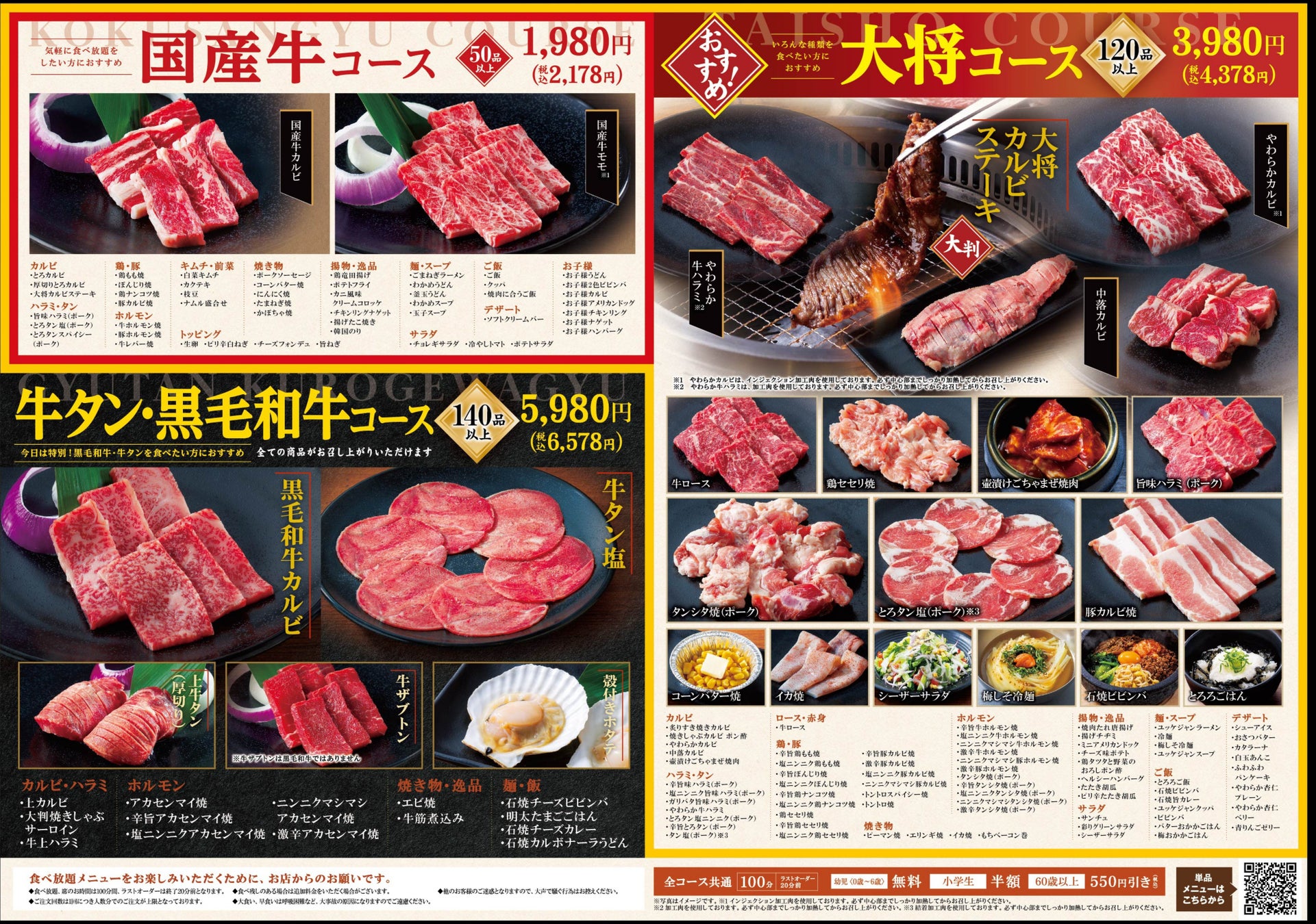 商品 :①国産牛食べ放題コース 50品以上 1,980円(税込2,178円)