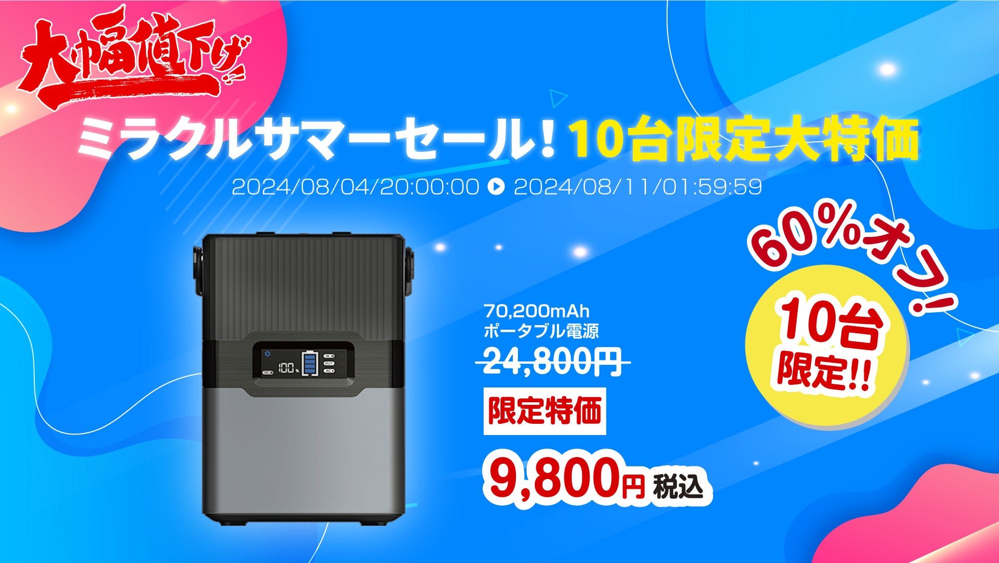 楽天「Show !t」は、8月4日20時開始の楽天お買い物マラソンにて緊急時や災害時、キャンプに役立つポータブル電源を10台限定、15,000円引きの60%オフで販売します。