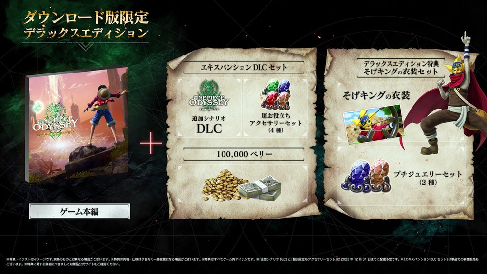 ※特典はすべてゲーム内アイテムです。※「追加シナリオDLC」と「超お役立ちアクセサリーセット」は2023年12月31日までに配信予定です。