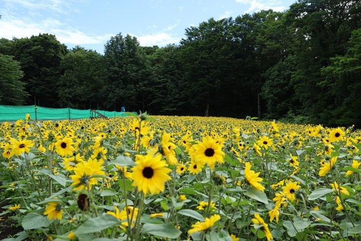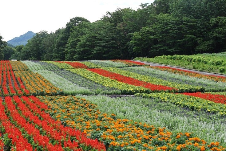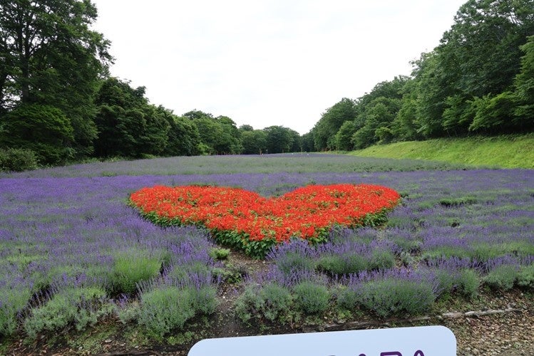 ラベンダーの他に、サルビアやマリーゴールドを虹のように植栽した「彩の丘」や、一面のひまわりが咲き誇る「ひまわりガーデン」真っ赤なサルビアをハート型に植栽した「ハートの畑」が見ごろを迎えています。8 月上旬にかけて西洋アジサイの「アナベル」が開花を控えており、より一層園内を彩る見込みです。