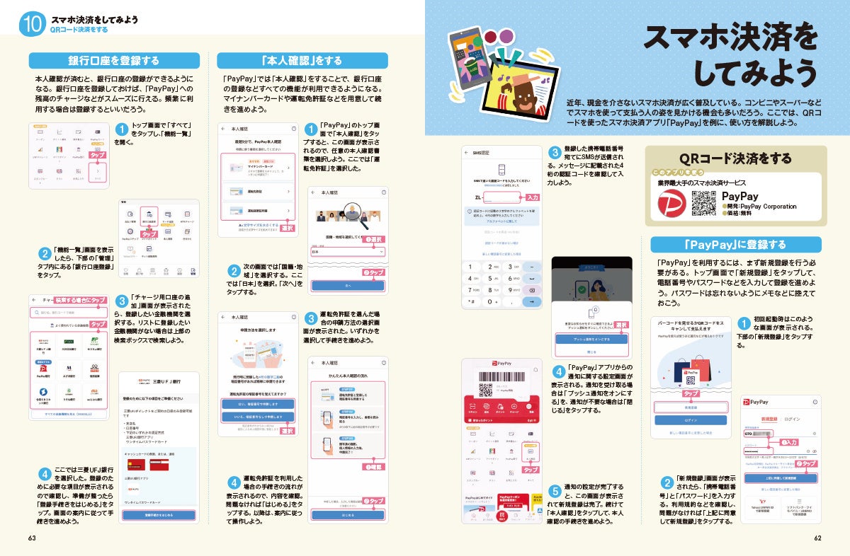 さらに、カメラアプリや地図アプリ、動画アプリや音楽アプリ、テレビ&ラジオアプリなど、マスターすると暮らしが豊かになるエンタメ系アプリも丁寧に活用法を紹介。また、近年広がりを見せるスマホ決済の導入方法や使い方をくわしく掲載しています。