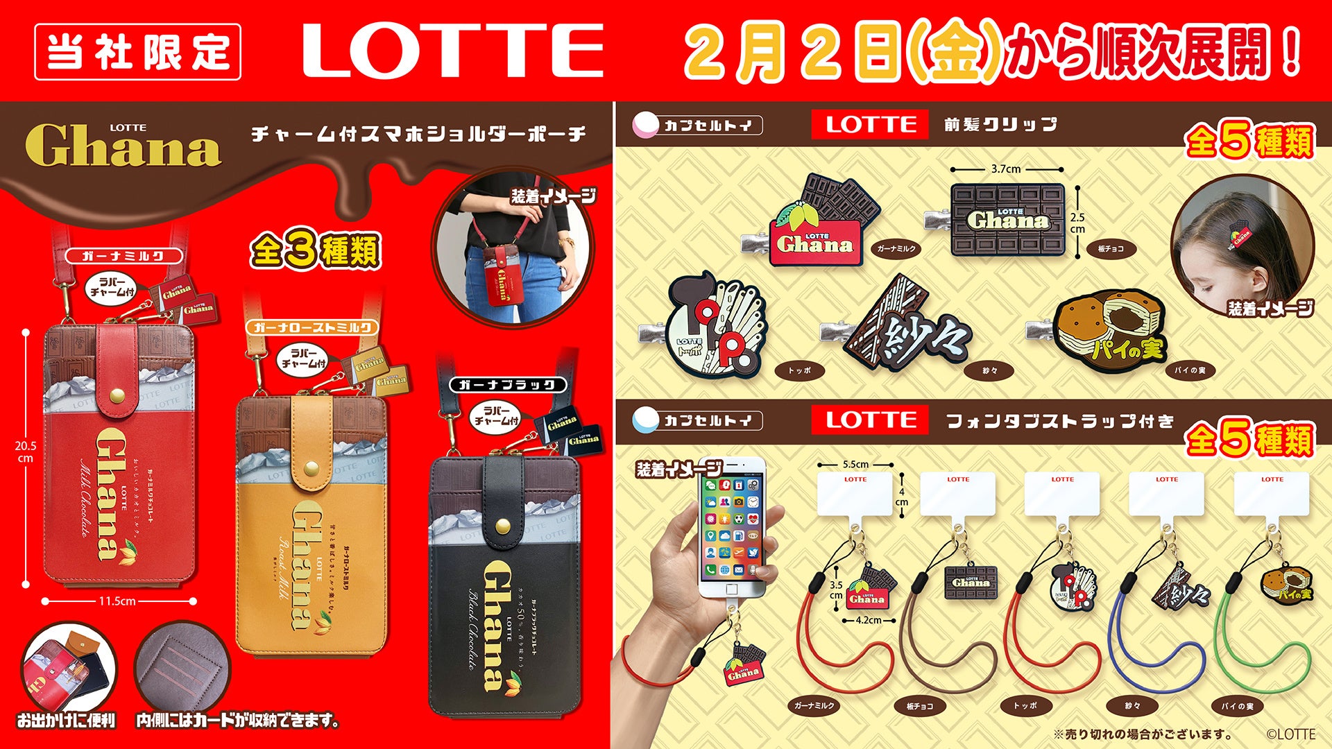 2月2日(金)より、『ロッテ』定番のチョコレートがスマホショルダーや前髪クリップになって登場!プライズでは「ガーナ」のパッケージデザインがかわいい「ガーナ チョコチャーム付きスマホショルダーポーチ」が、カプセルトイでは「トッポ」「紗々」「パイの実」デザインの「前髪クリップ」と「ストラップ付きフォンタブ」が登場します。バレンタインシーズンにぴったりなスイートでキュートなアイテムです。