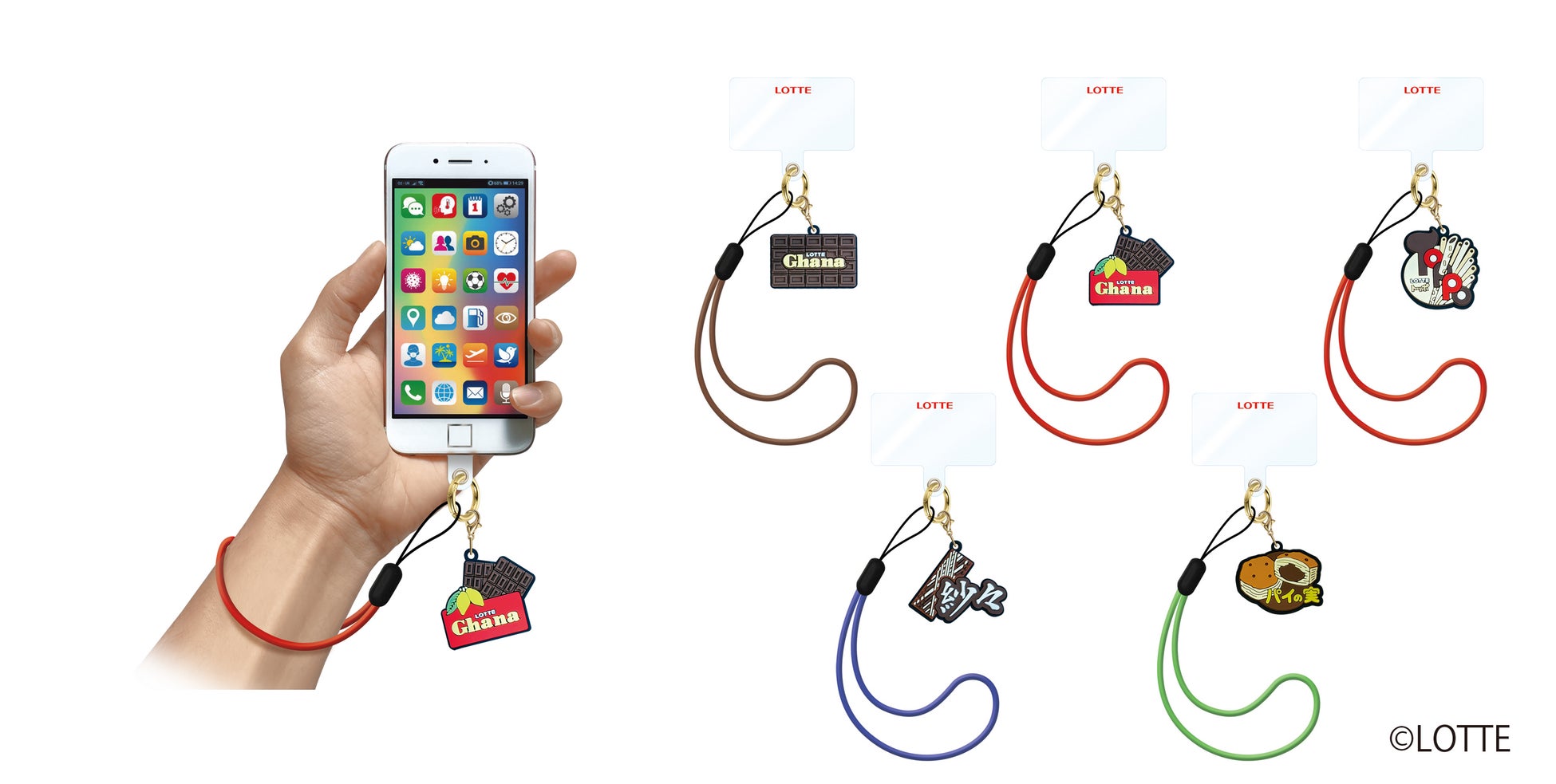 「ガーナチョコ」、「トッポ」、「紗々」、「パイの実」のロゴとお菓子がデザインされたストラップ付きのフォンタブ。