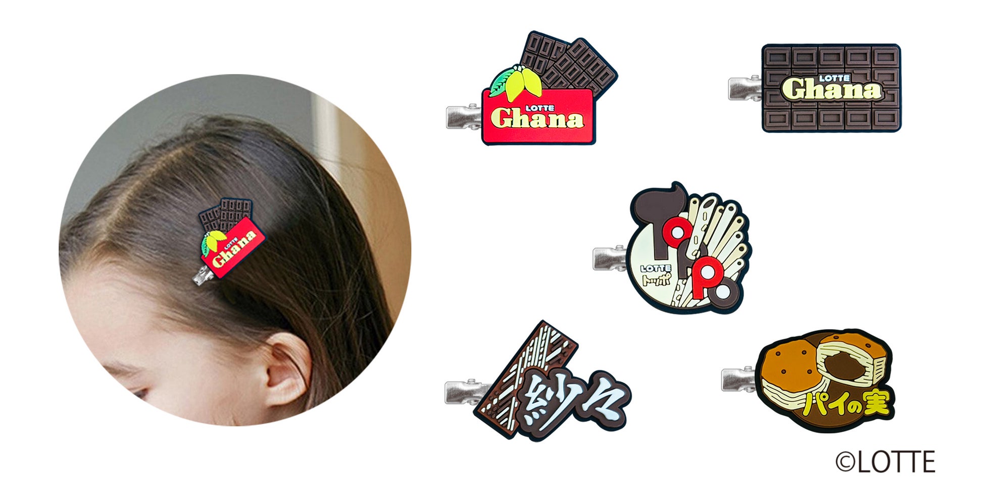 「ガーナ」、「トッポ」、「紗々」、「パイの実」のロゴとお菓子がデザインされた前髪クリップ。