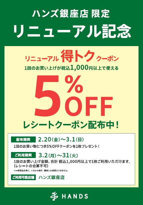 リニューアルオープンを記念して、ハンズ銀座店でお買い上げいただきましたお客様へ5%OFFクーポンを配布します。