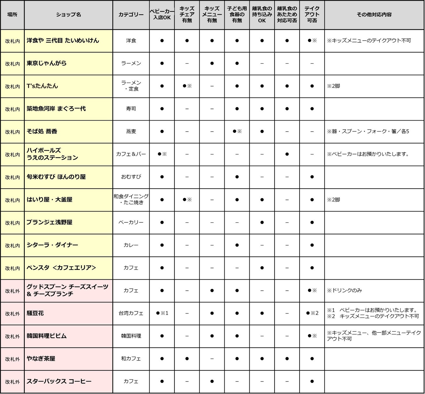 また赤ちゃん・子どもとお出かけの際は、授乳室がどこにあるか、ベビーカーは持込OKか、キッズメニューがあるか等も、子連れファミリーには気になるポイントです。そこでエキュート上野では「うえの エキナカ こどもガイド」として、子連れのお客さま向けサービスをまとめました。夏のお出かけに、散策や観光の途中に、ぜひご活用ください。
