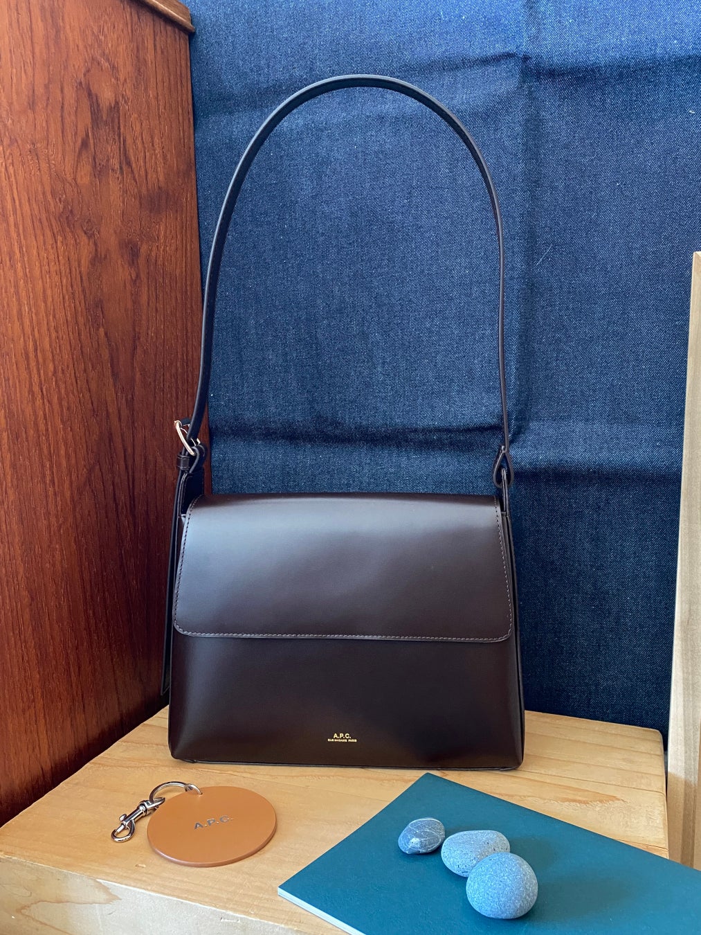 A.P.C.ロゴのあしらわれたスクエアのメタルパーツは華やかなタッチを添え、見た目の美しさだけでなく、機能性とエレガンスが融合したバッグです。