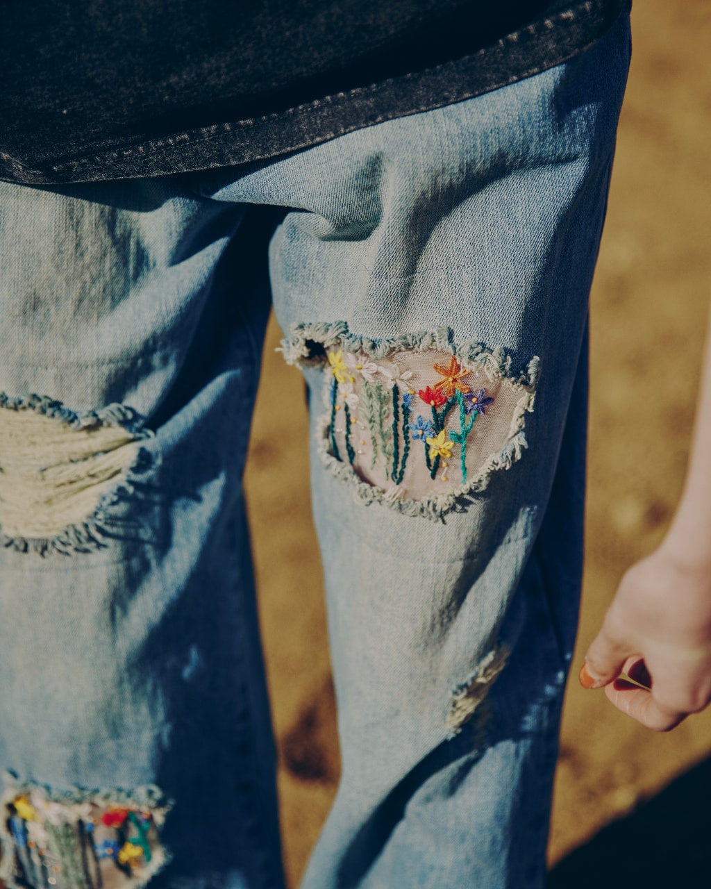 「穴が空いてしまったお気に入りのデニムに、自分で花の刺繍をした自己流リメイク」のようなイメージで作ったデニムパンツ。