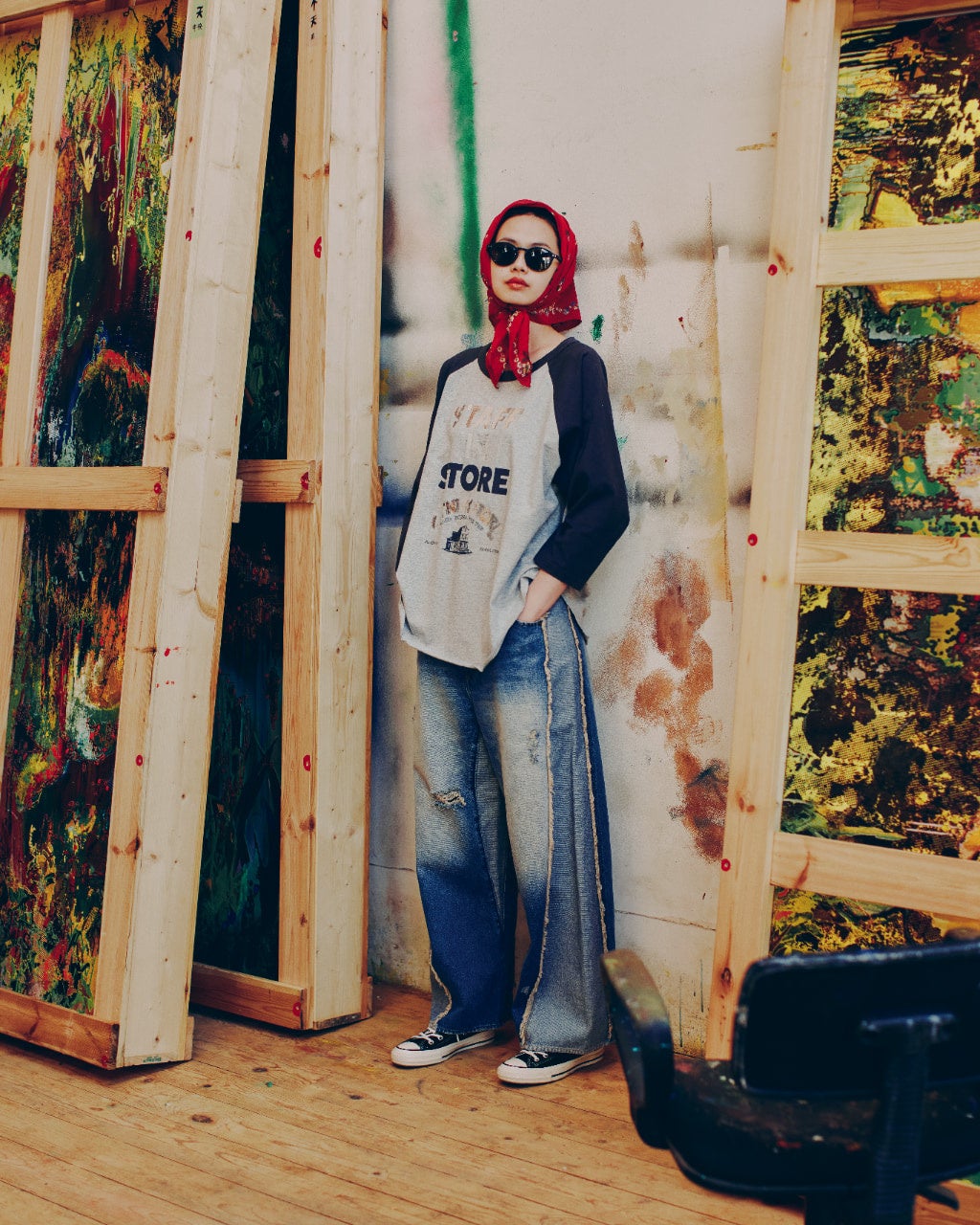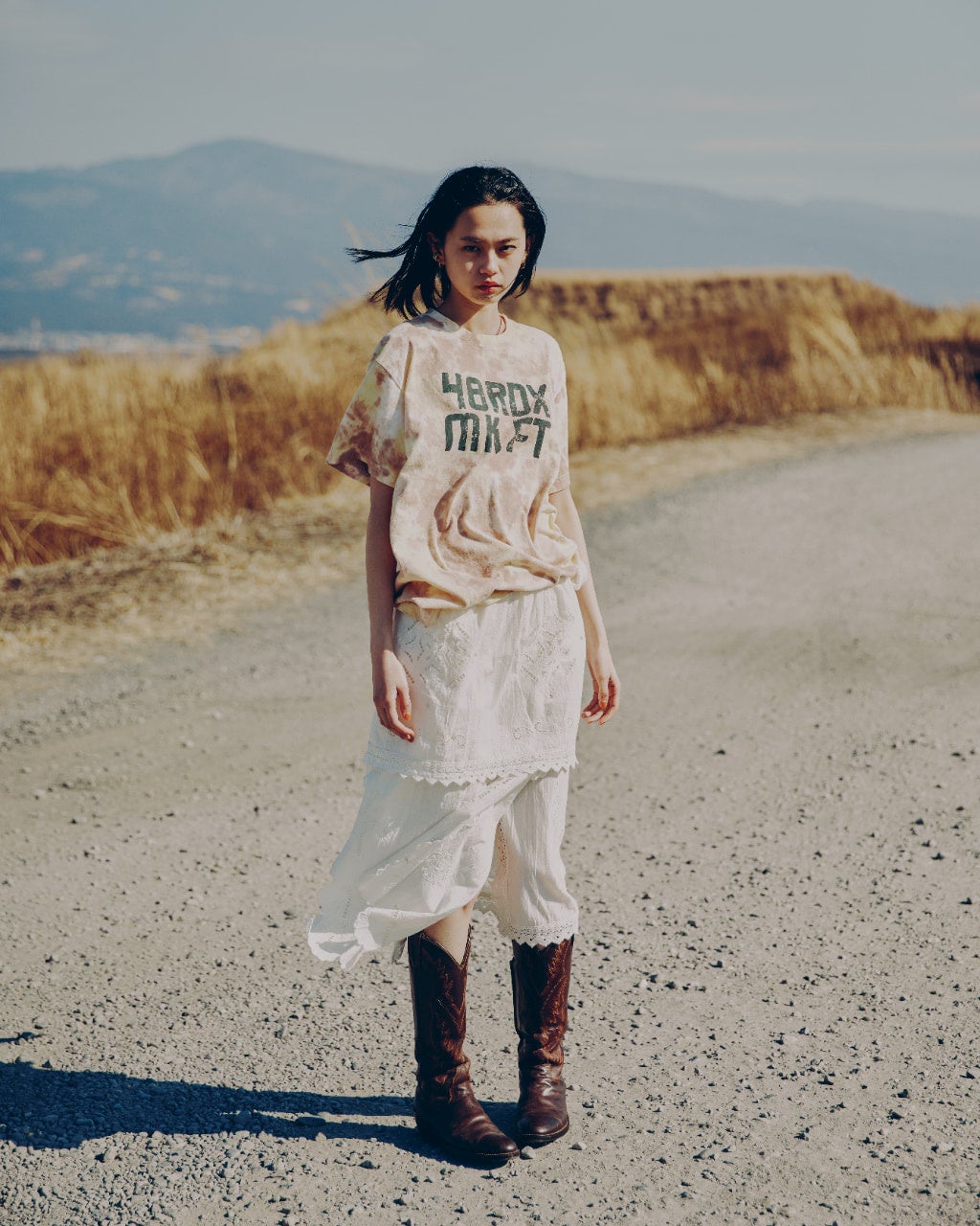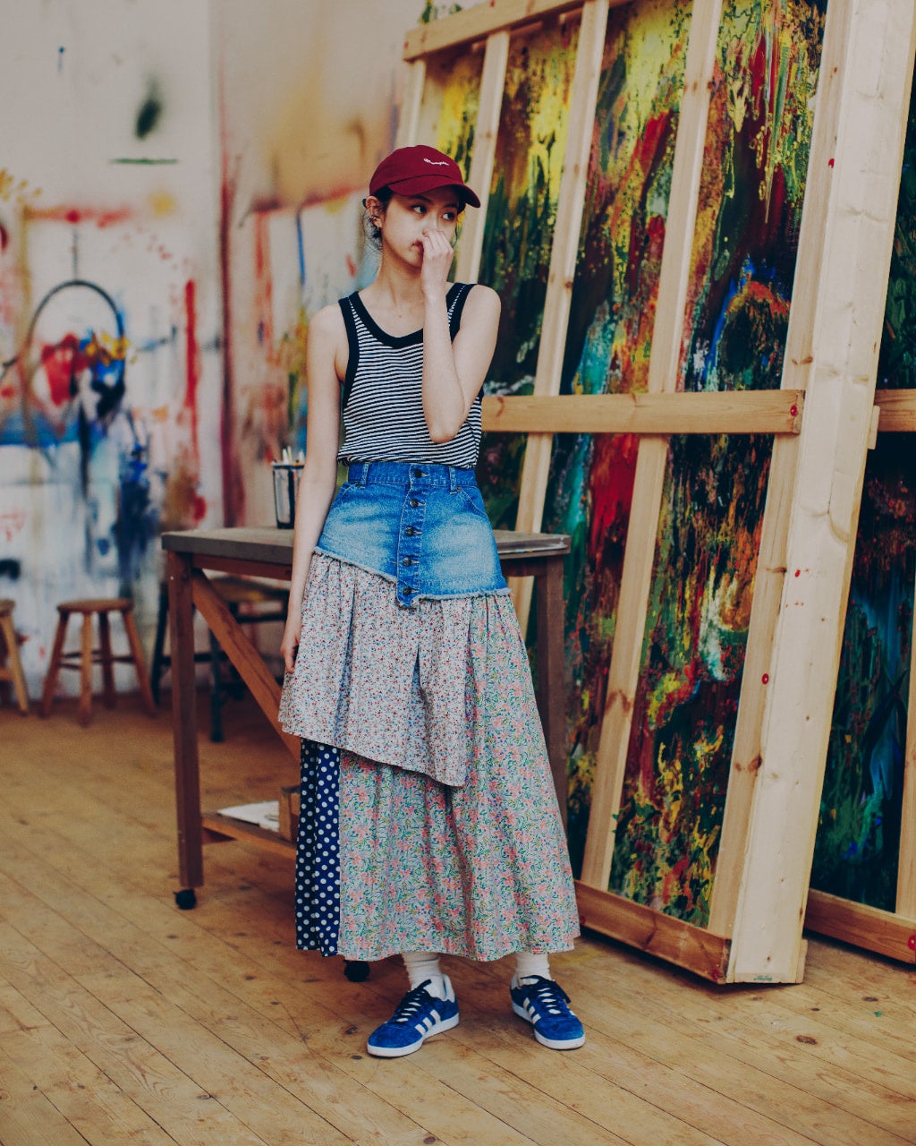いくつもの刺繍やレースを複雑に重ねた巻きスカートを合わせて、カジュアルさと甘さがミックスされたスタイリングに。