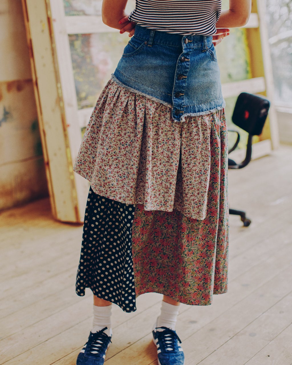 レトロな花柄と水玉を組み合わせ、ユニークで着映えするスカート。