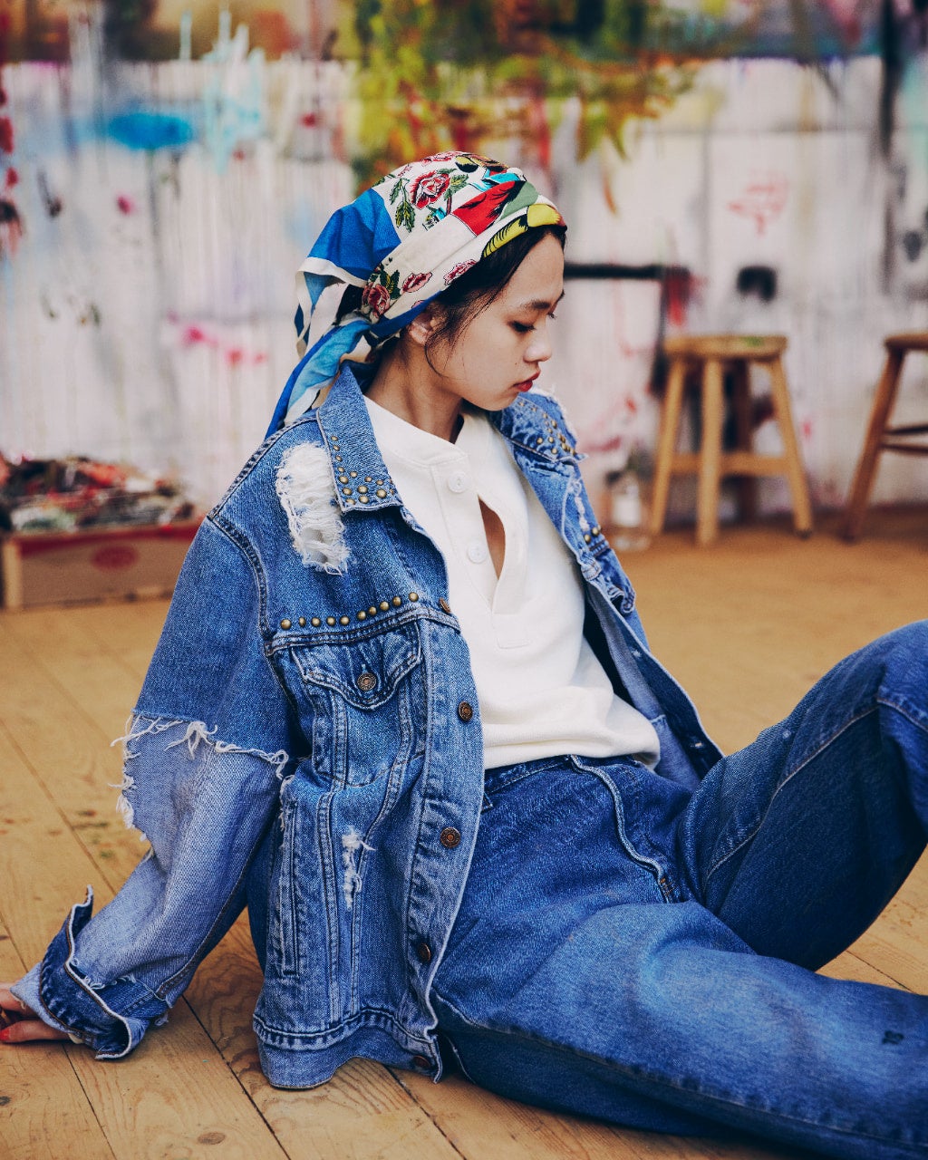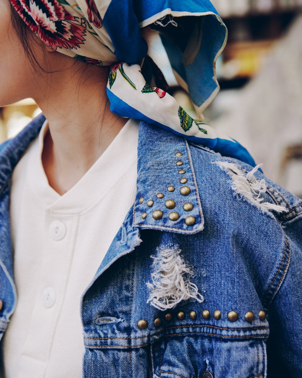 カラフルな花刺繍にビーズも取り入れて、春らしいハッピー感のあるデニムです。