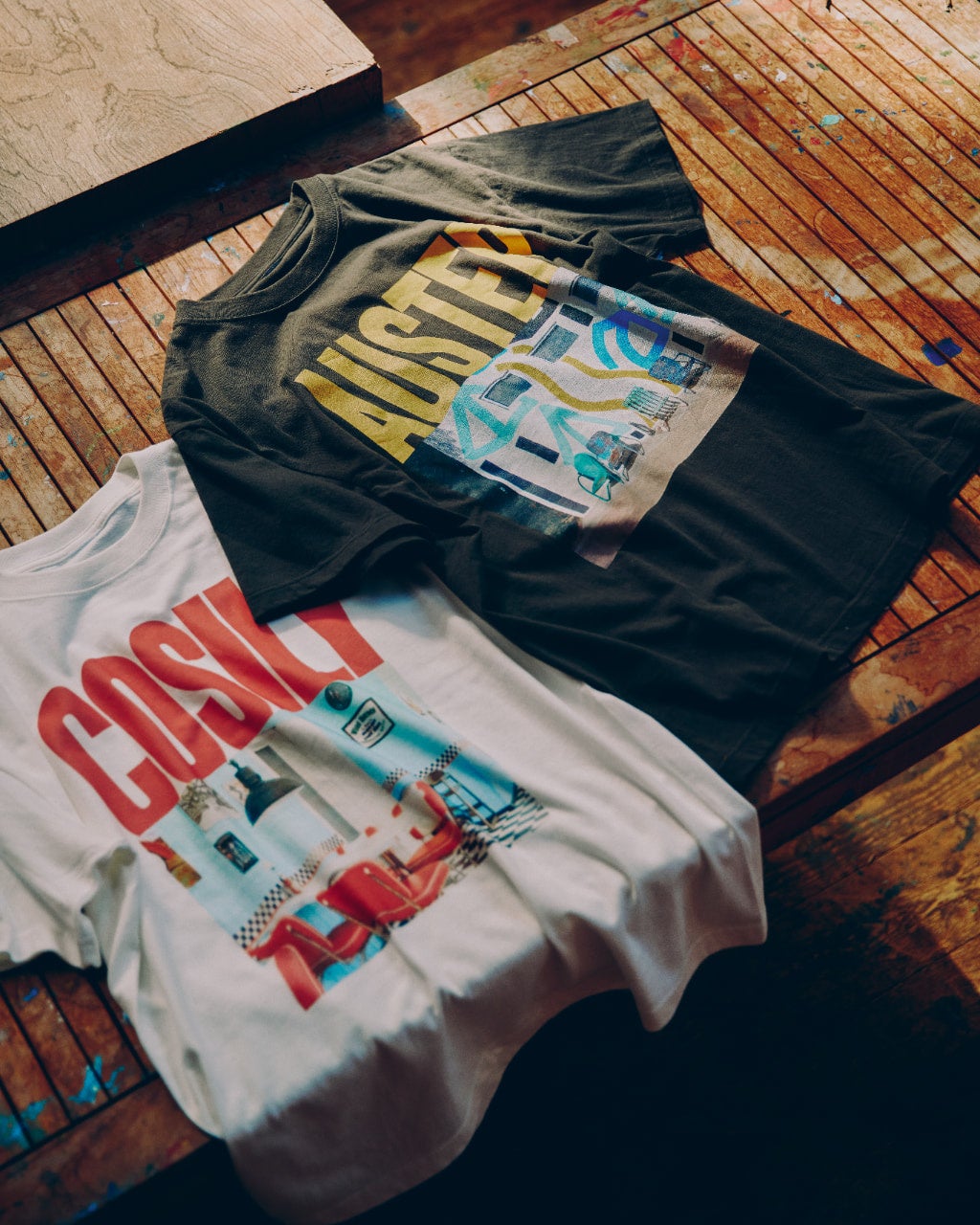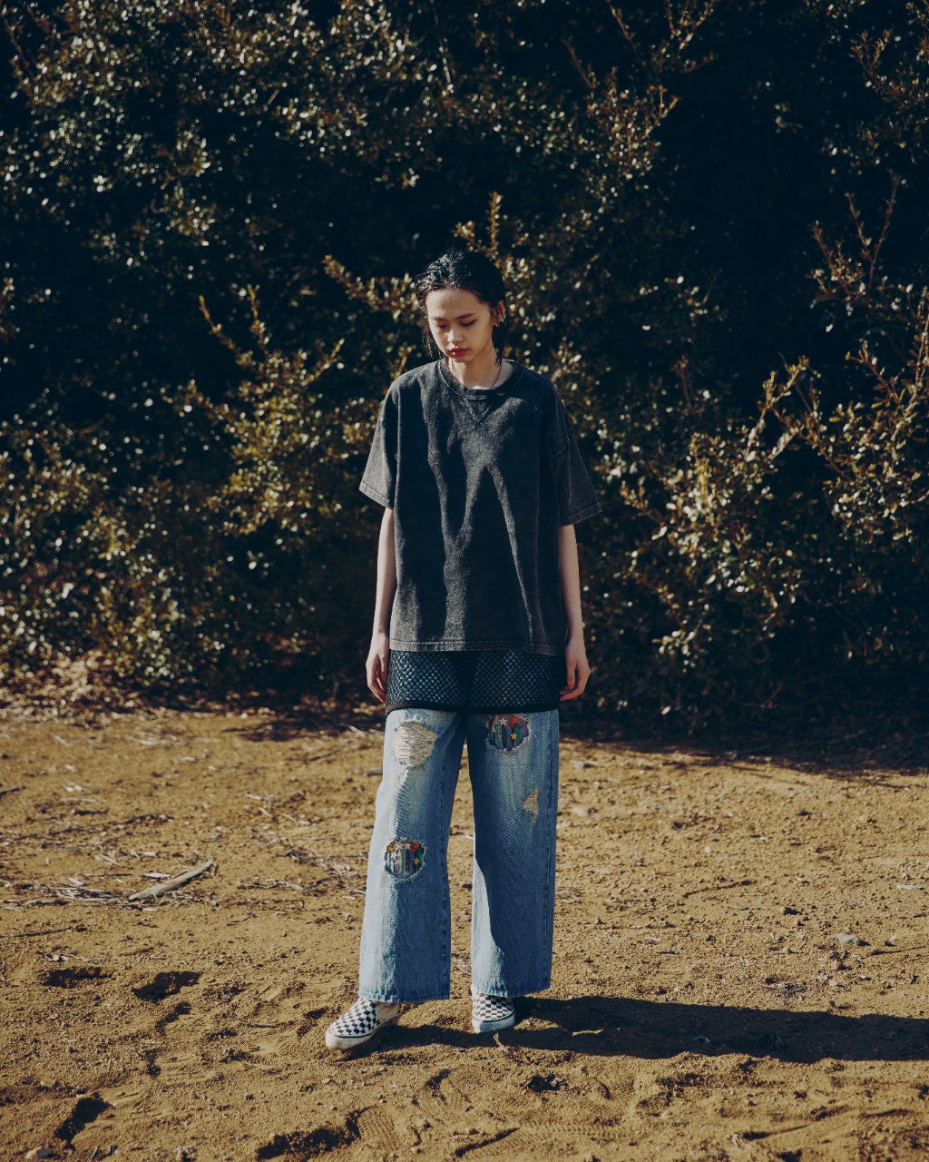 ホワイトはプリントしたあとに洗い加工を施し、ブラックはプリント前にフロスト加工で若干の色褪せた感じを出すことで古着のような色褪せを表現しました。