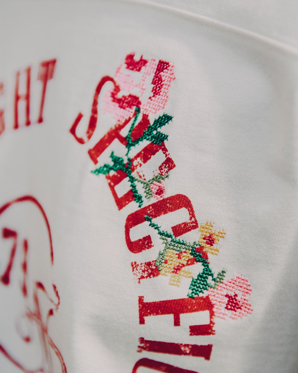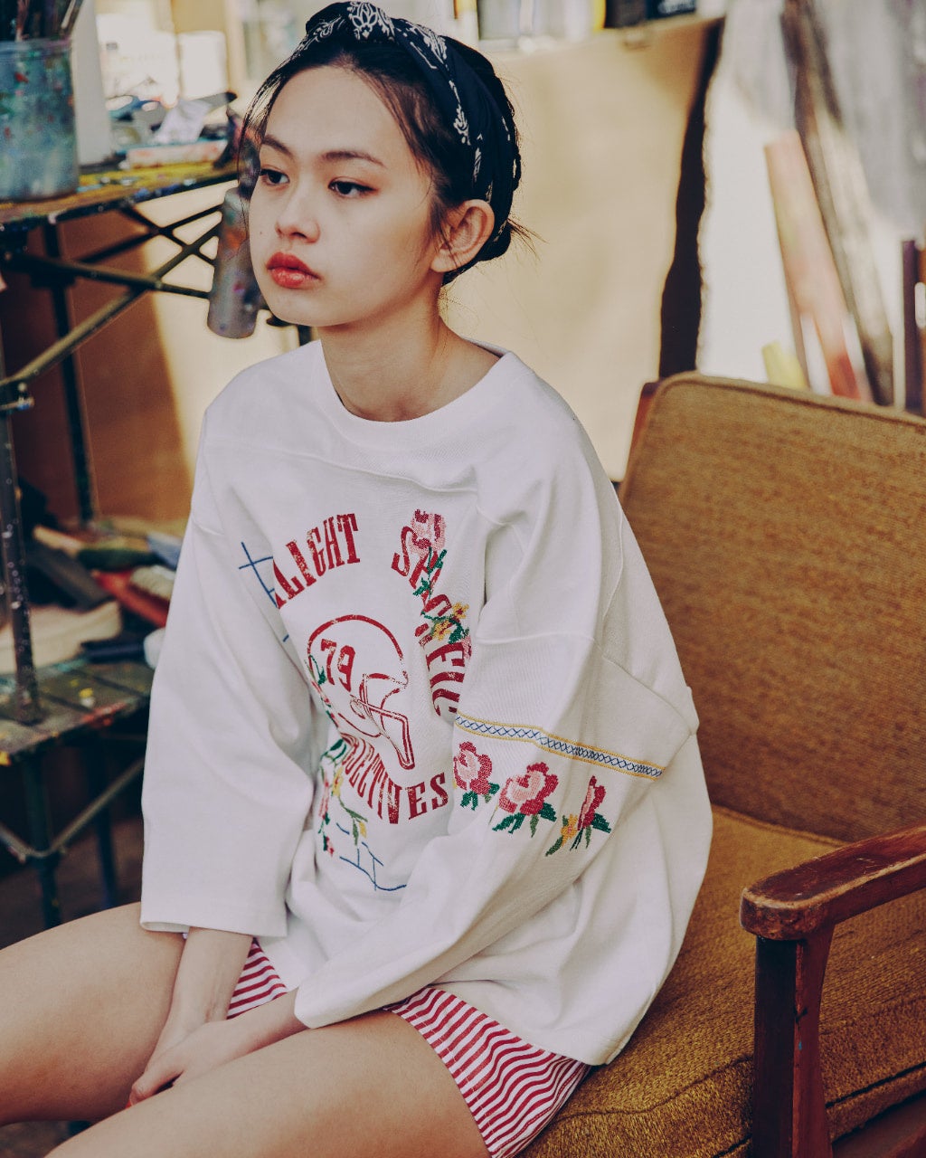 カジュアルなフットボールシャツの形にカラフルな花モチーフの刺繍が散った、ミックス感がFreadaらしいTシャツ。