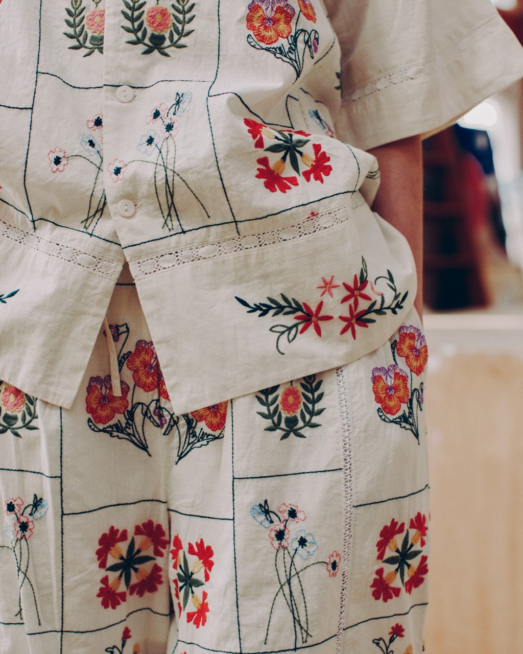 鮮やかな刺繍が前面に入ったパッチワーク刺繍シャツのセットアップ。
