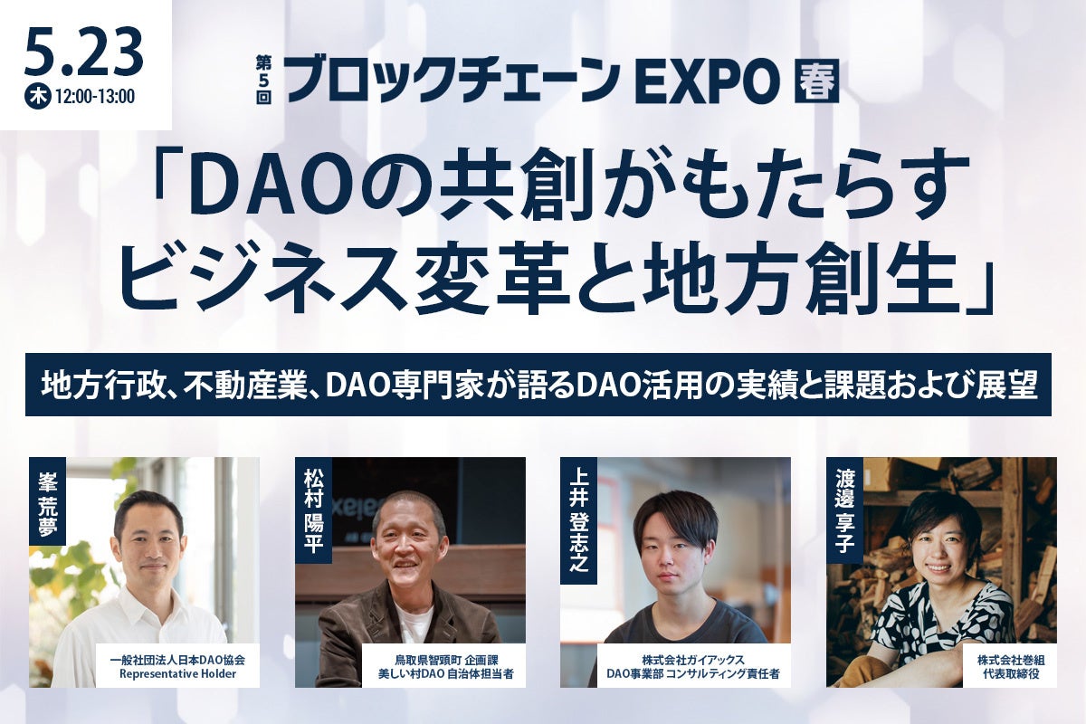 講演タイトルは「DAOの共創がもたらすビジネス変革と地方創生」。自治体のキーパーソン、DAOを活用する事業者、そして多数のDAO組成支援を行うガイアックスや日本DAO協会の専門家を交え、DAO組成から運用までの課題やトークンやインセンティブの設計、コミュニティ運営、また、4月の法改正を踏まえた今後の展望を語ります。