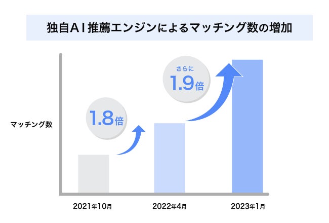 株式会社リンクバル(本社:東京都中央区、代表取締役社長:吉弘和正、証券コード:6046、以下「リンクバル」)が運営するマッチングアプリ「CoupLink(カップリンク)」は、独自開発したAI推薦エンジン(以下、独自AI推薦エンジン)のアップデートを重ね、それまでと比較してマッチング数を最大1.9倍増加することに成功いたしましたのでご報告いたします。
