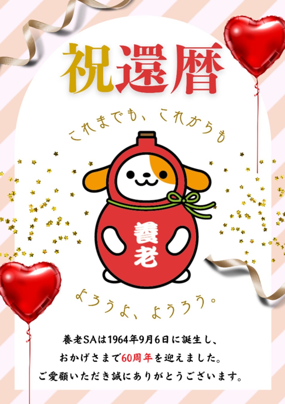 中日本エクシス株式会社 一宮・岐阜支店(愛知県一宮市栄、支店長・新田(にった) 浩之(ひろゆき))は、E1 名神高速道路(名神) 養老サービスエリア(SA)(上下、岐阜県養老郡養老町)にて、供用開始60周年を記念し、お客さまへ日ごろのご愛顧に感謝を込めて、「養老SA還暦イベント」を開催します。