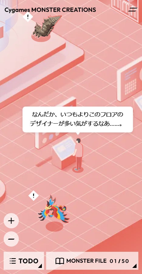 本アートコンテンツはスマホやPCでお楽しみいただけます。オンライン上の研究所でマップ内のモンスターに触れるとイラストと説明を閲覧できます。そして「モンスターファイル」にモンスターを登録し、ファイルの完成を目指していきます。