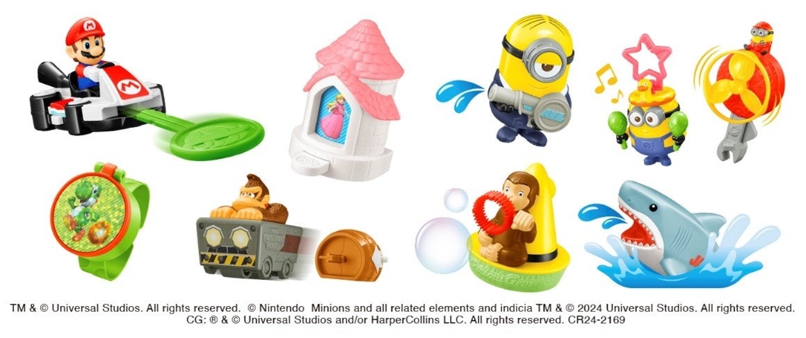 2024年 7 月 12 日(金)より発売されるハッピーセットを購入すると、ユニバーサル・スタジオ・ジャパンのキャラクターたちとのコラボレーションが実現した特別なおもちゃ「ユニバーサル・スタジオ・ジャパン オールスターズ」がもらえます。