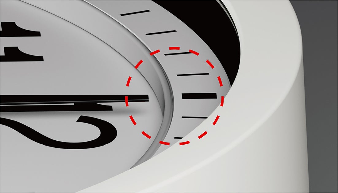 目盛の高さと時分針の高さをそろえることで、斜めから見ても正確な時刻が読み取りやすくしました。また数字には判読性の高いユニバーサルデザインフォントを採用しています。直径 41cm と大きめで、時分針も太く視認性を高めていますので、多くの人が集まるオフィスなどの環境にふさわしい時計です。
