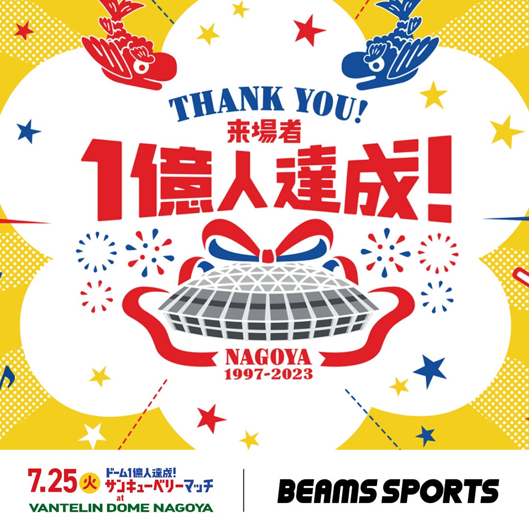 株式会社ビームス(本社:東京都渋谷区、代表取締役社長:設楽洋)が展開するスポーツとファッションの掛け合わせで、誰もが楽しめるスポーツカルチャーをプロデュースする〈BEAMS SPORTS(ビームススポーツ)〉は、中日ドラゴンズの本拠地、「バンテリンドーム ナゴヤ」が2023年6月15日に開場から来場者数累計1億人を突破したことを記念して7月25日(火)に開催される『ドーム1億人達成!サンキューベリーマッチ 中日ドラゴンズvs DeNAベイスターズ』で、様々な記念コンテンツを実施します。