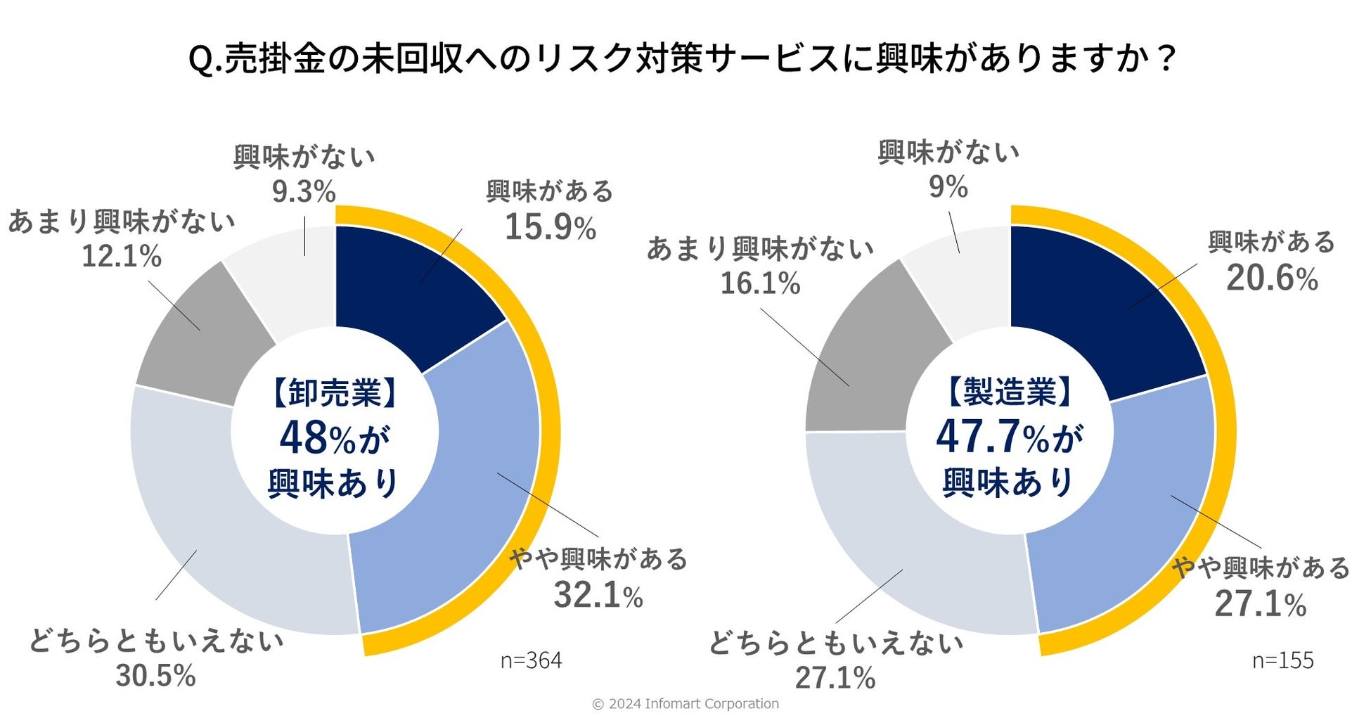 現金取引を実施している企業が多い中、「未回収リスク対策ができるサービスへの興味度」を聞いたところ、卸売業(n=364)の48%、製造業(n=155)の47.7%が「興味あり」と回答しました。