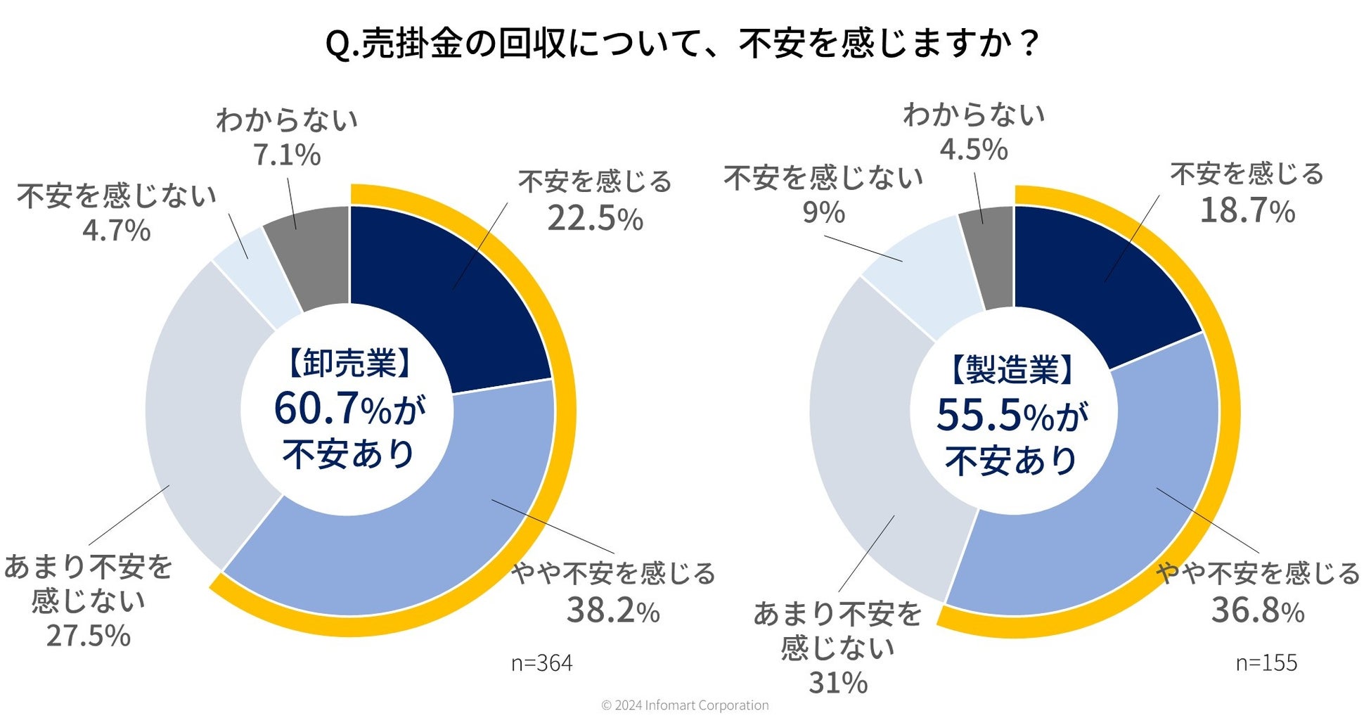 「売掛金の回収について不安を感じるか」について聞いてみると、卸売業(n=364)で22.5%が「不安を感じる」、38.2%が「やや不安を感じる」と回答。製造業(n=155)では18.7%が「不安を感じる」、36.8%が「やや不安を感じる」と回答し、約6割が売掛金の回収について不安を抱えていることがわかりました。