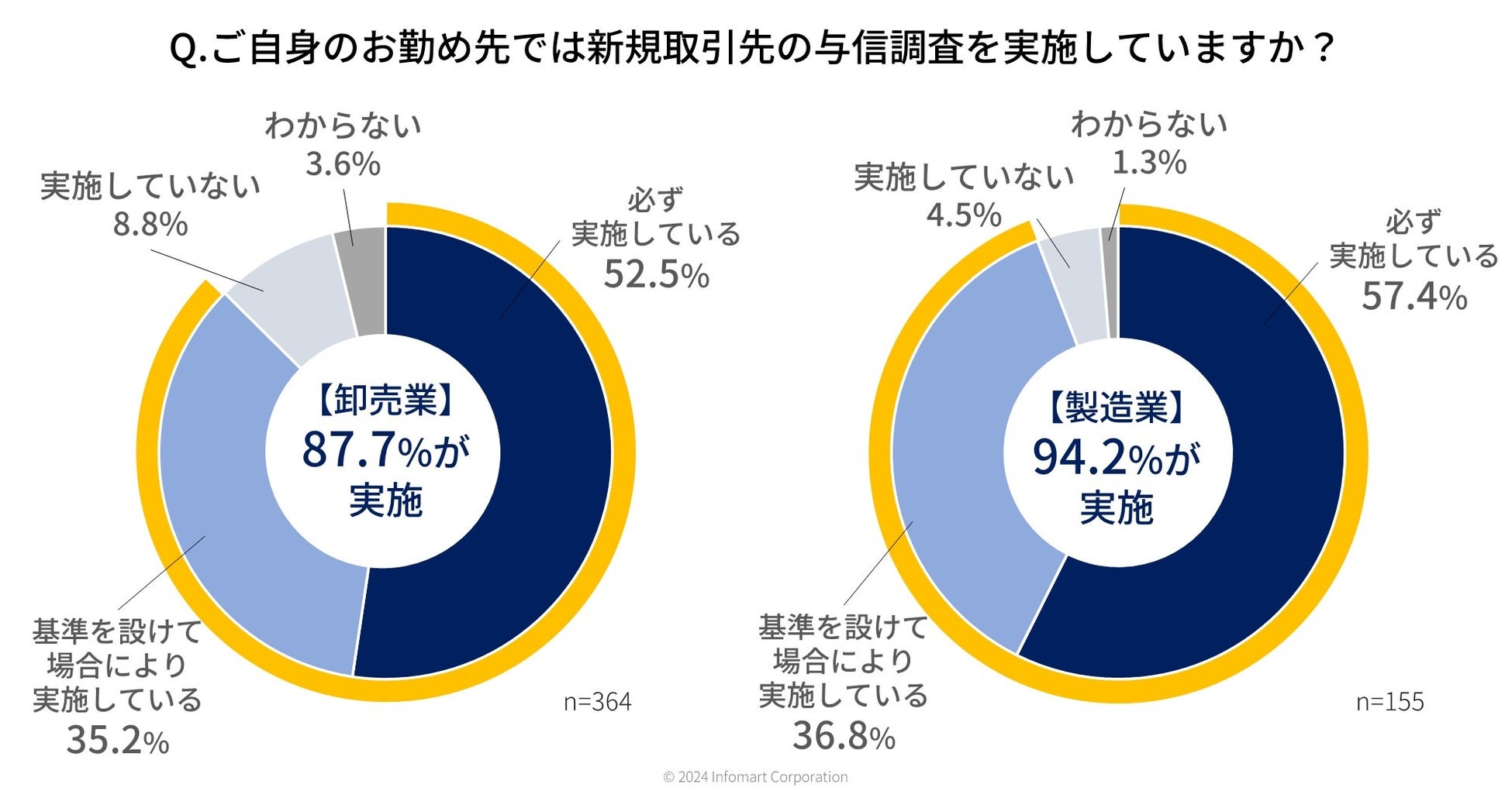 新規取引先の与信調査の実施有無について、卸売業(n=364)で52.5%が「必ず実施している」、35.2%が「基準を設けて場合により実施している」と回答。製造業(n=155)では57.4%が「必ず実施している」、36.8%が「基準を設けて場合により実施している」と回答し、約9割が与信調査を実施していることが分かりました。