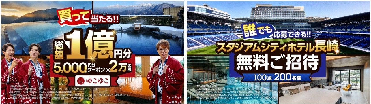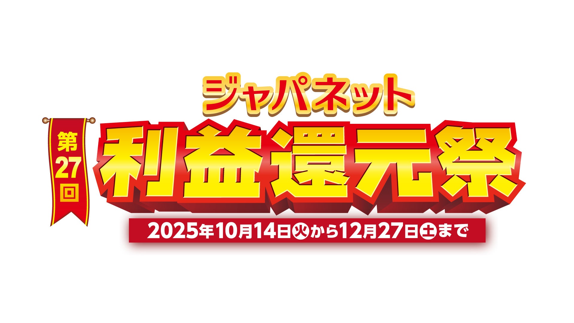株式会社ジャパネットたかた (本社:長崎県佐世保市/代表取締役社長:髙田旭人)は、2025年10月14日(火)より「第27回 ジャパネット利益還元祭」を開催いたします。利益還元祭は、ジャパネットが1年間のご愛顧への感謝の気持ちをお届けするキャンペーンで、お客様にご好評の商品をラインナップし還元祭特価で販売します。さらに、2つの懸賞企画をご用意。全国の温泉宿のご宿泊にご利用いただける総額1億円の「ゆこゆこ」クーポンのプレゼントと、スタジアムシティホテル長崎へ100組200名を無料ご招待。ご購入いただいた方はもちろん、誰でもご応募いただける企画として展開いたします。