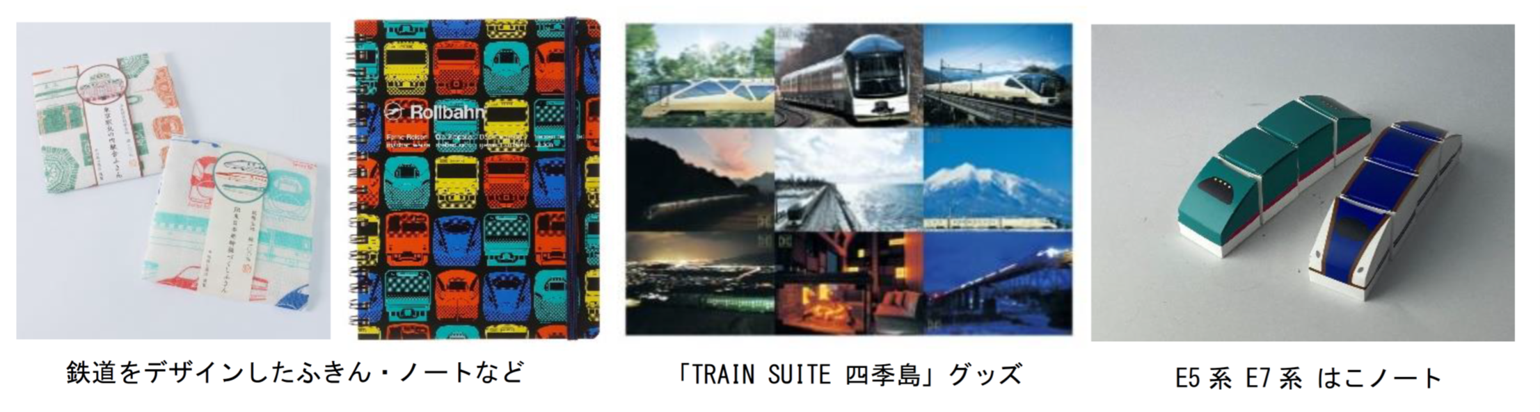 ブースでは、東京駅やJRE MALL、鉄道博物館を中心に展開している「TRAINIART」の商品をはじめ、「TRAIN SUITE四季島」がデザインされたポストカード、ノートを切り離し組み立てると新幹線E5系やE7系の箱となる工作キット「はこノート」を販売し、商品を通じて日本の鉄道を身近に感じていただきます。