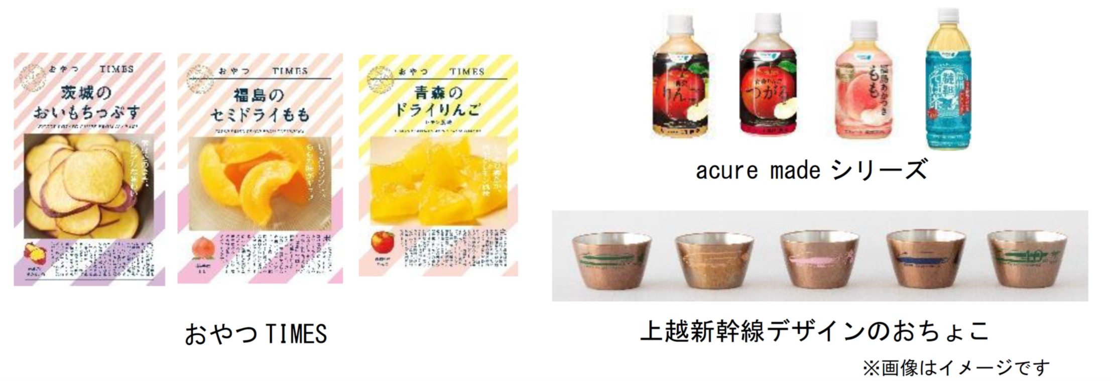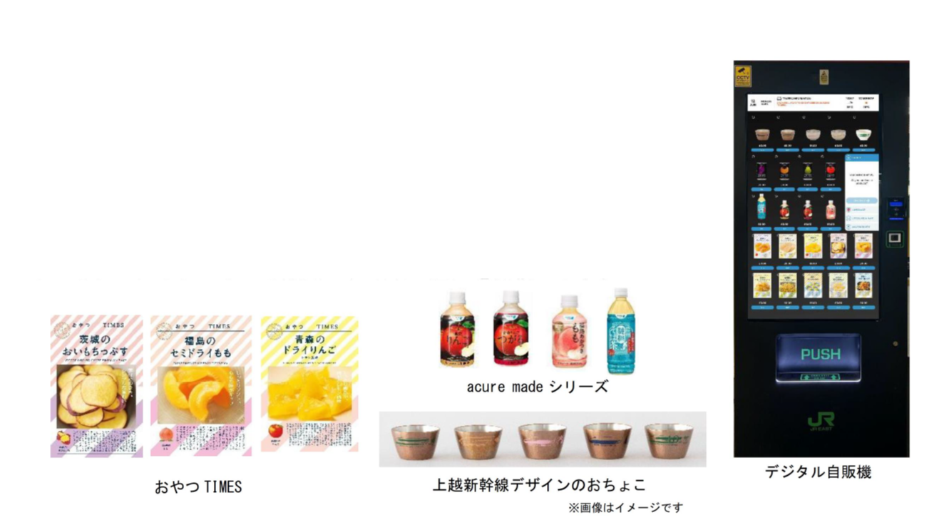 JR東日本が英国で展開しているデジタル自販機を活用し、日本の地産品を販売することで、地産品の海外販路の拡大に貢献します。各地域の魅力のつまった「おやつTIMES」や、acure madeシリーズの中でも地域の素材を活用した「青森りんごシリーズ」などを販売します。また、無人駅(帯織駅)を利用したものづくりの交流拠点「EkiLab帯織」を通じて開発された燕三条エリアの伝統技術である鎚起銅器(ついきどうき)に上越新幹線がデザインされたおちょこなども販売し、地域の魅力を発信します。