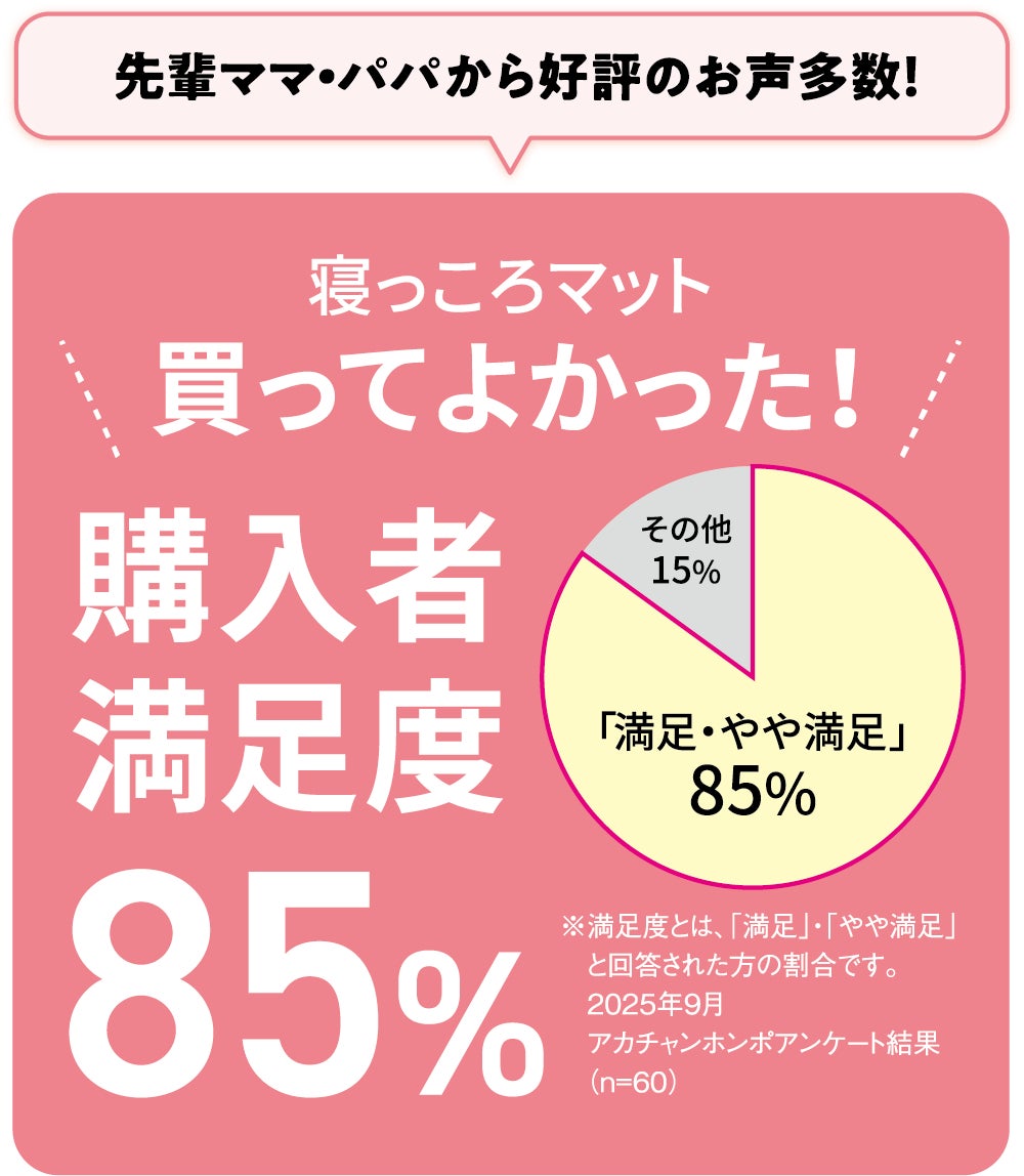 「買ってよかった!」と先輩ママ・パパから好評の声をいただき、購入者満足度も85%※を獲得。このマットがあれば、赤ちゃんのおふろタイムがとってもラクに!出産準備用品にもおすすめです。