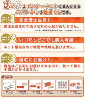 『まるくじ』はインターネットで購入できるハズレなしの抽選くじサービスです。各アイテムがすべて受注生産なので売り切れの心配はありません。(※)